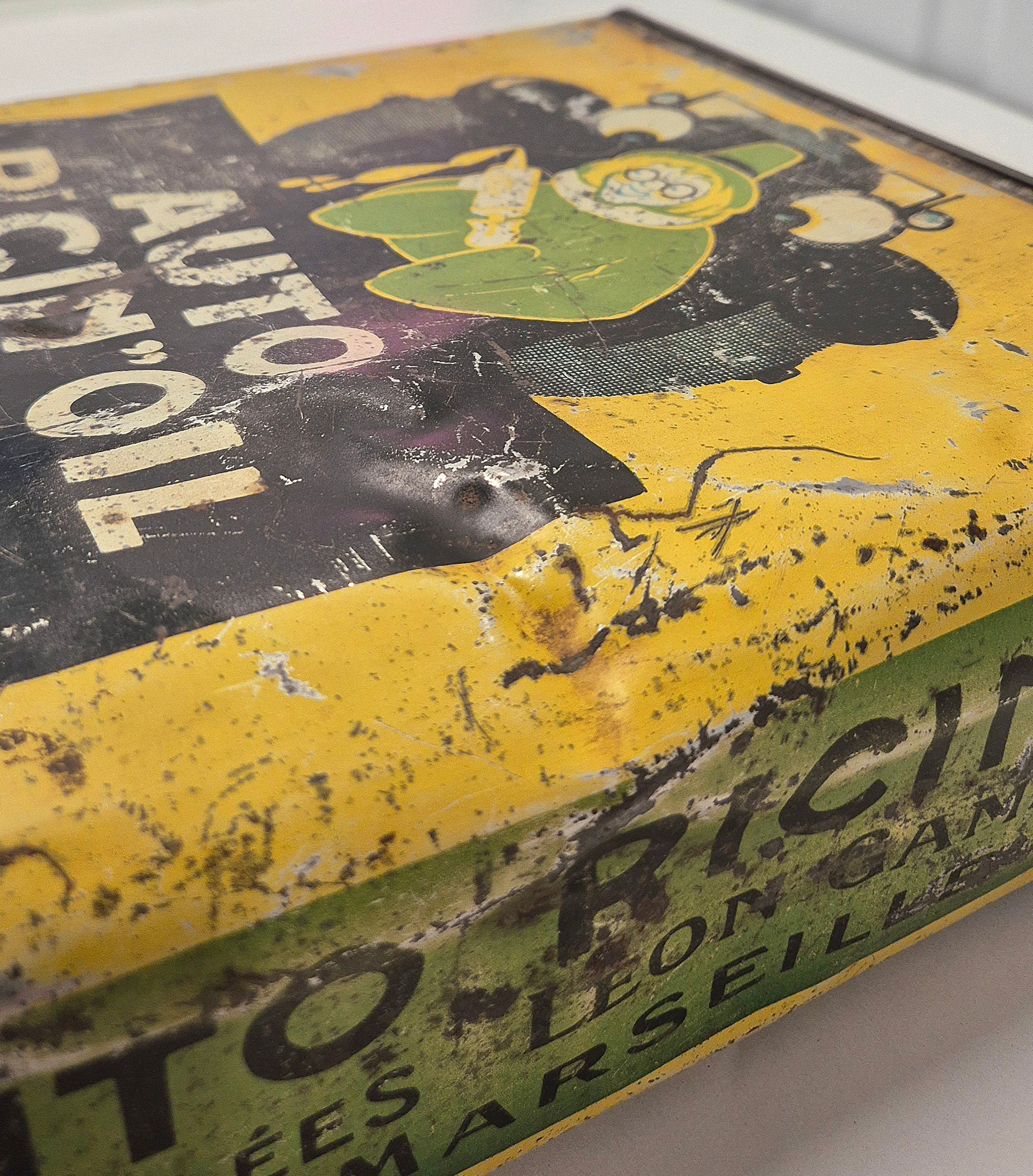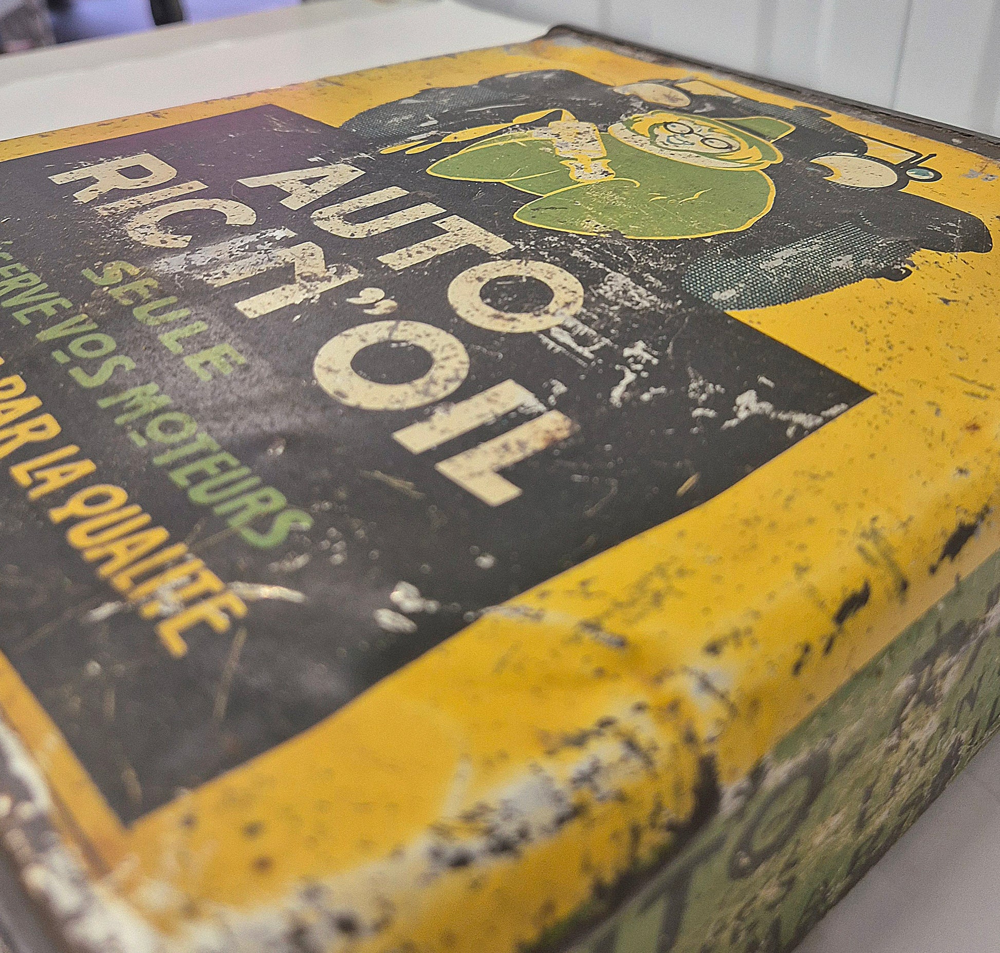 Très rare bidon d'huile Auto Ricin'Oil, état moyen, plusieurs enfoncements et traces d'usages, format 5 litres pas courant ! Avec poignée et bec verseur. Envoi avec assurance.