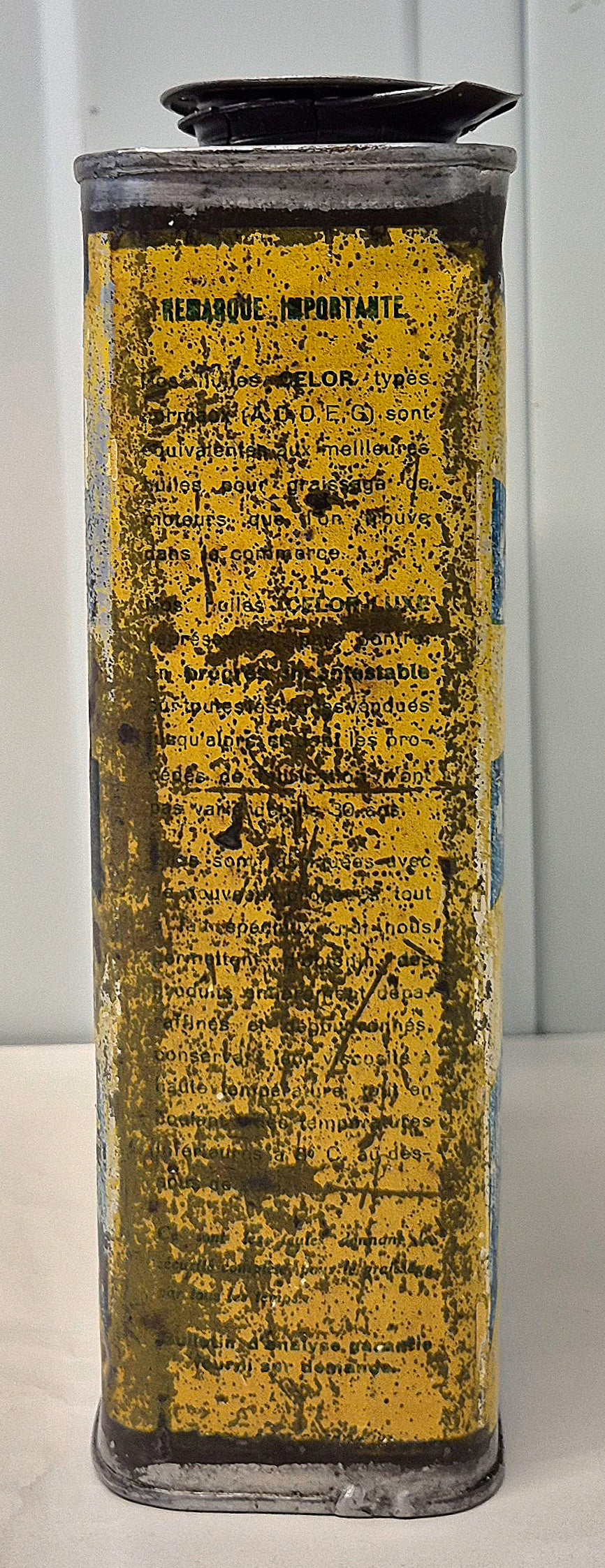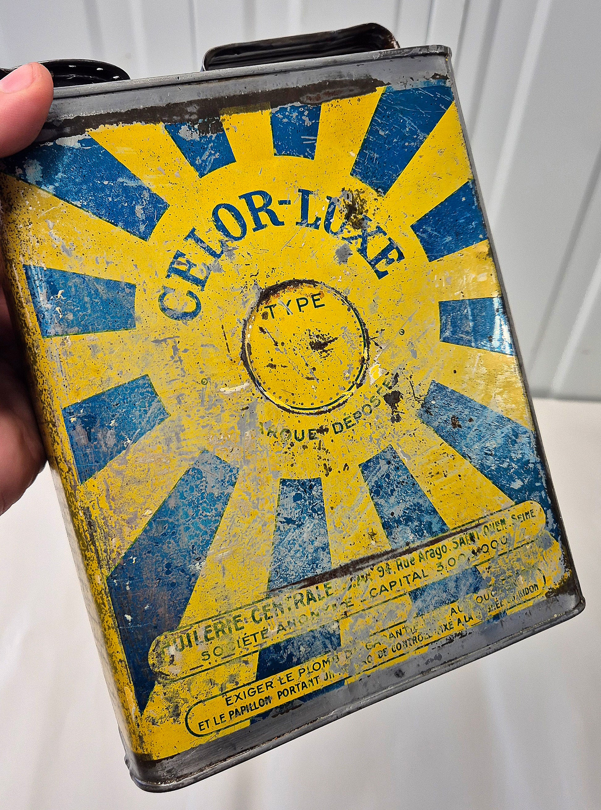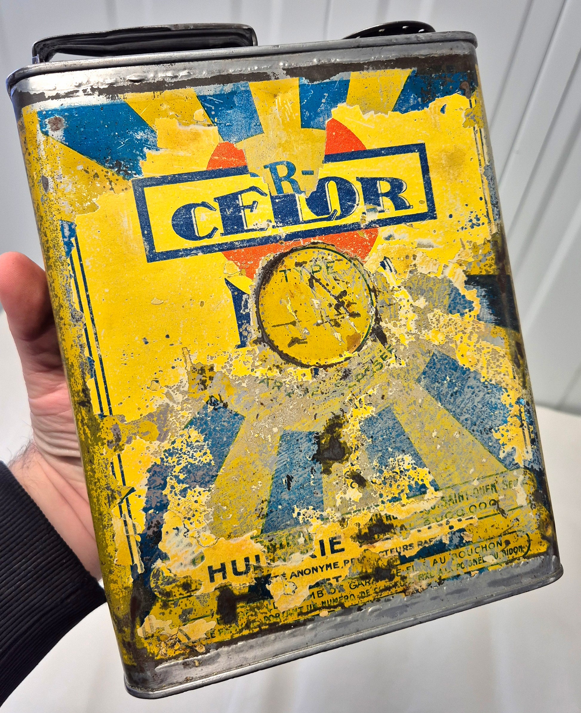 Très rare bidon d'huile celor luxe, malheureusement en état moyen, il était recouvert d'un bandage Celor classique qui a détérioré la couche du dessous... bidon a finir de nettoyer sur la deuxième face... litho "luxe" très fragile si l'on souhaite retirer la couche "Celor"