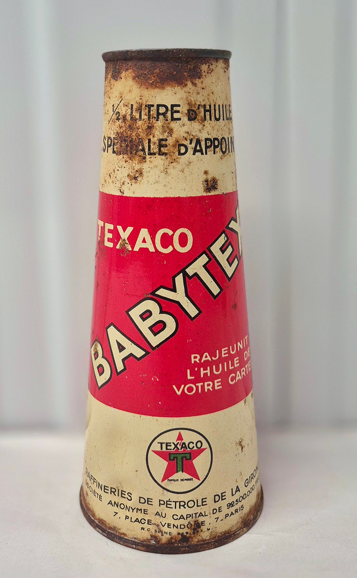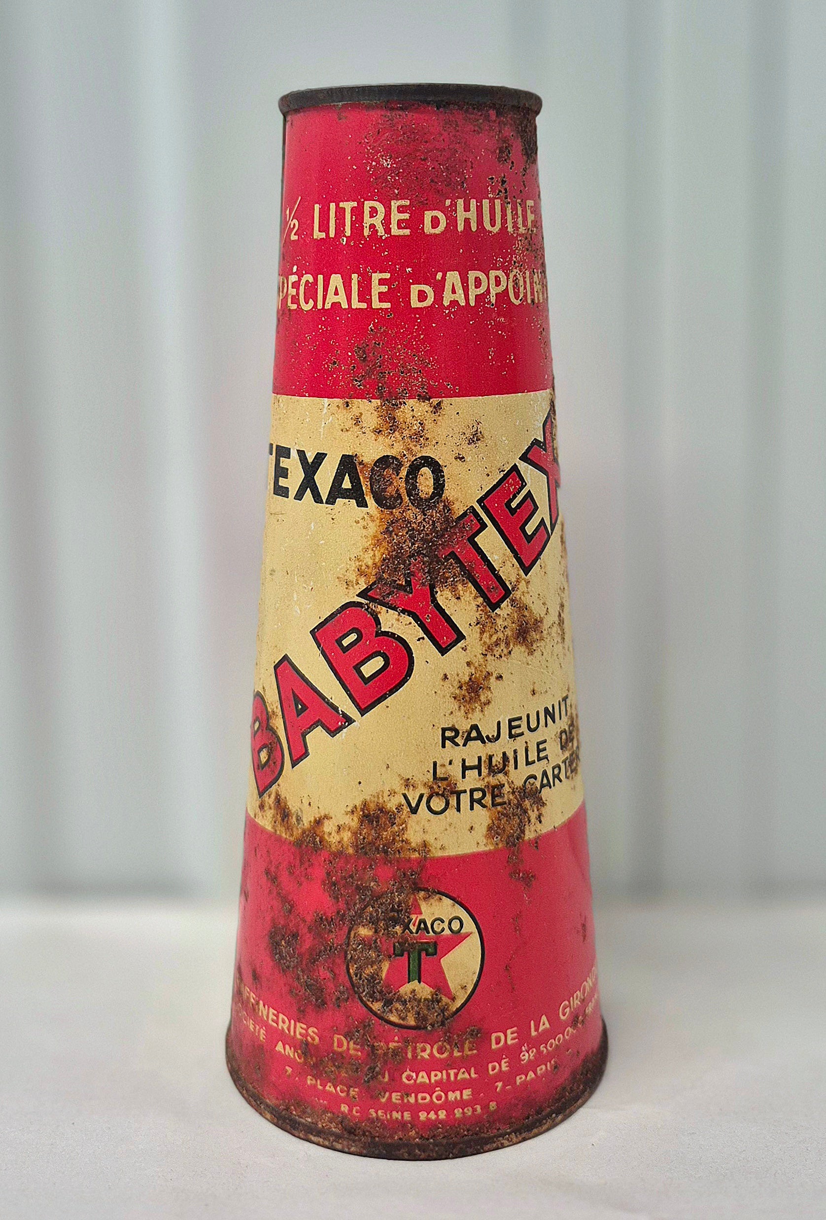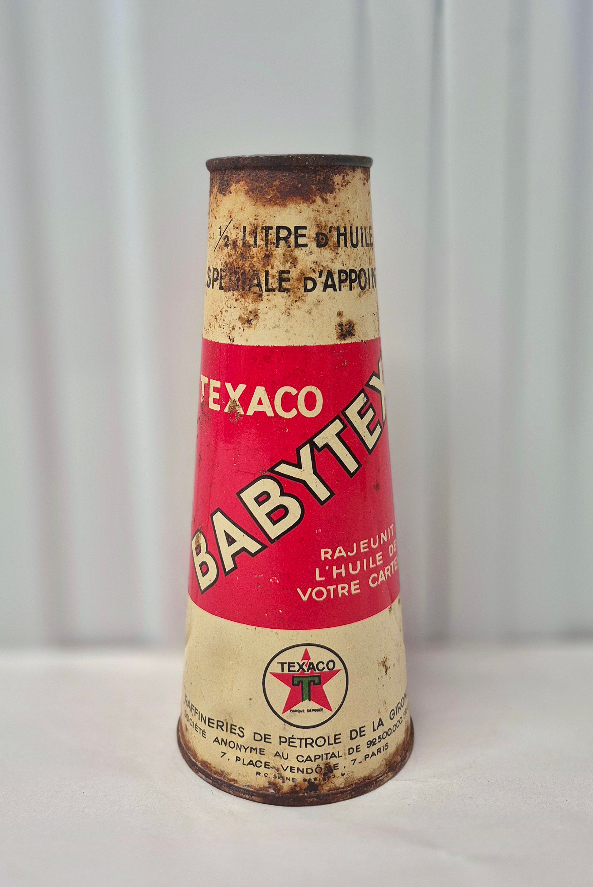 Joli bidon d'huile conique Babytex Texaco, en tôle lithographiée, bon état général, traces de rouilles et défauts, litho bien brillante, ouvert sur le dessus, voir photos