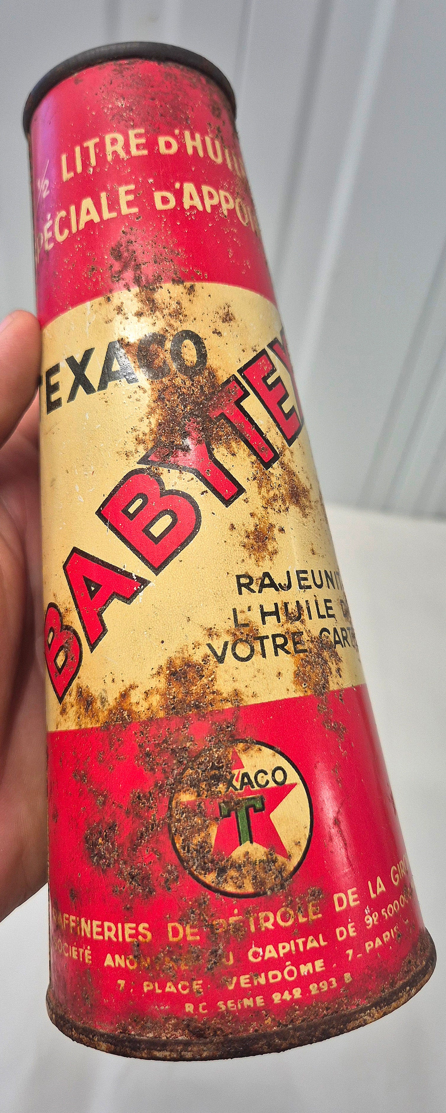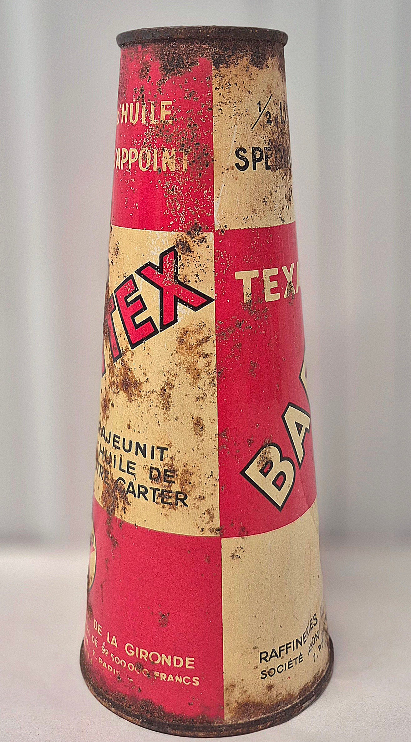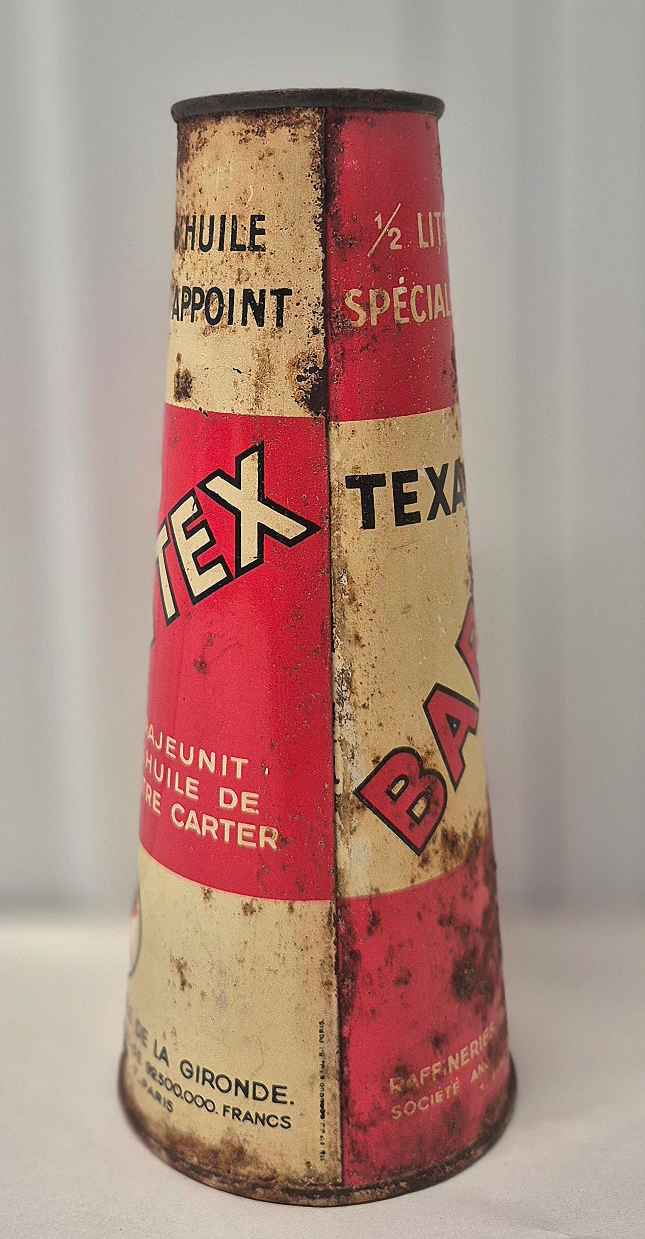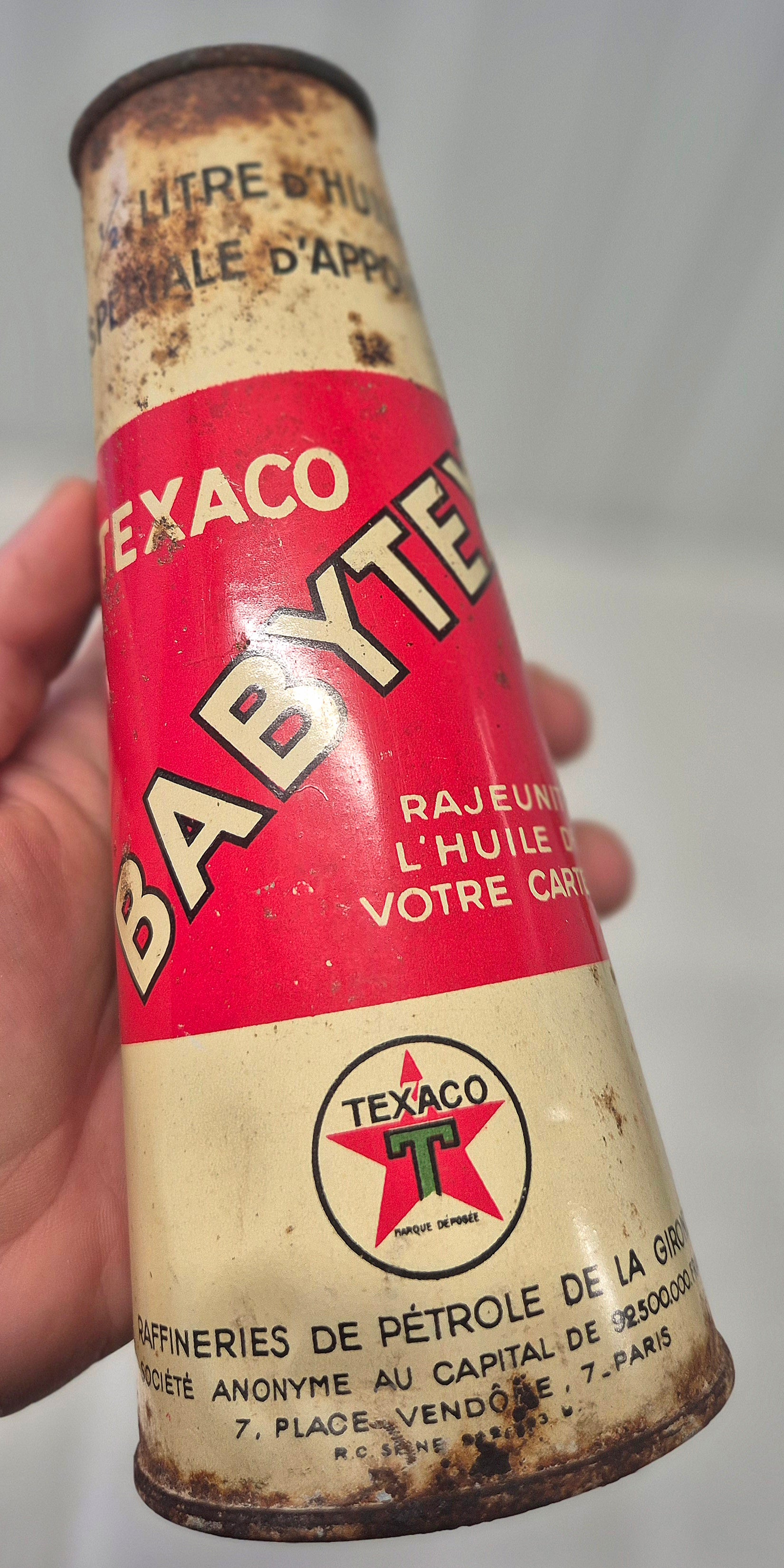 Joli bidon d'huile conique Babytex Texaco, en tôle lithographiée, bon état général, traces de rouilles et défauts, litho bien brillante, ouvert sur le dessus, voir photos