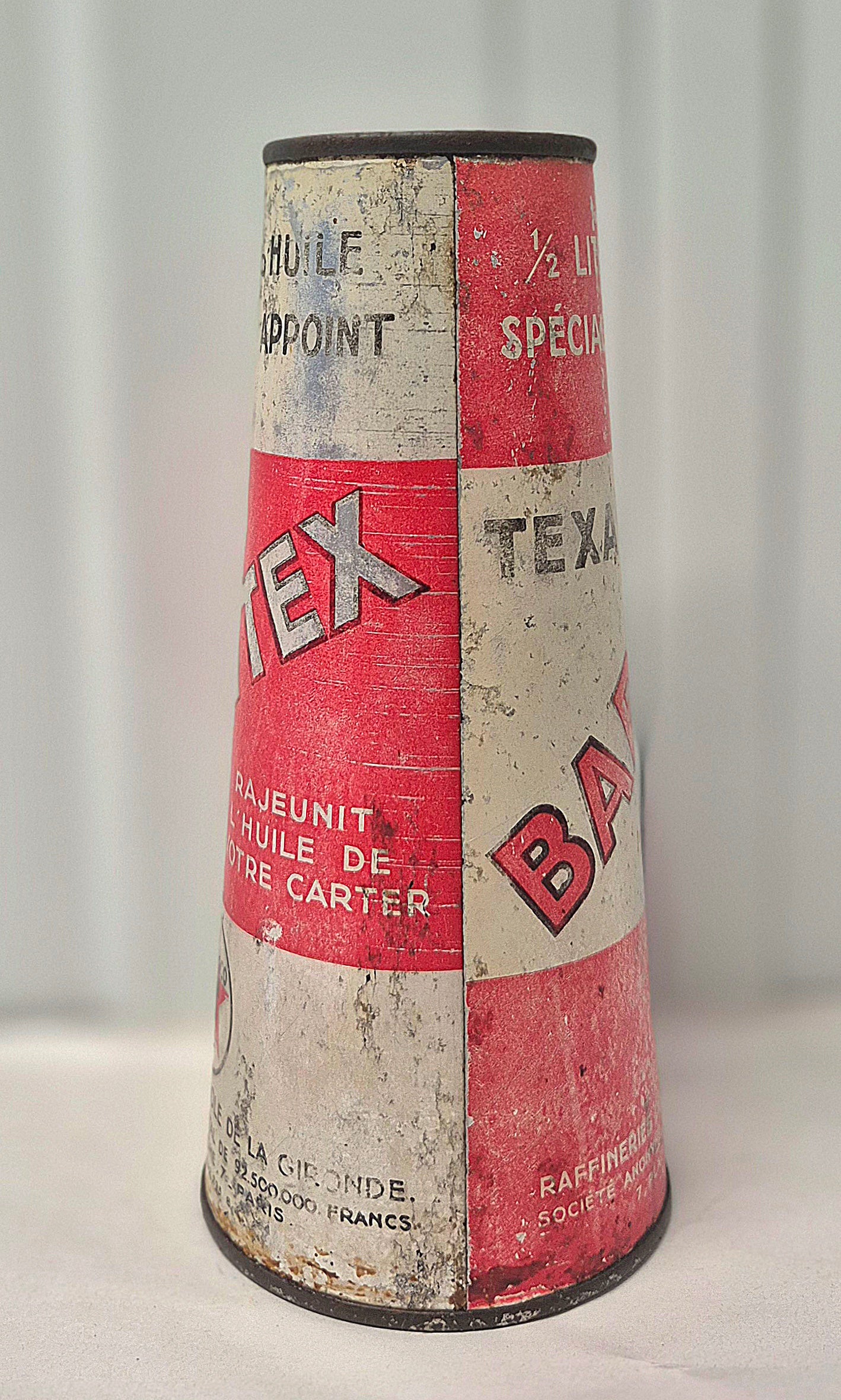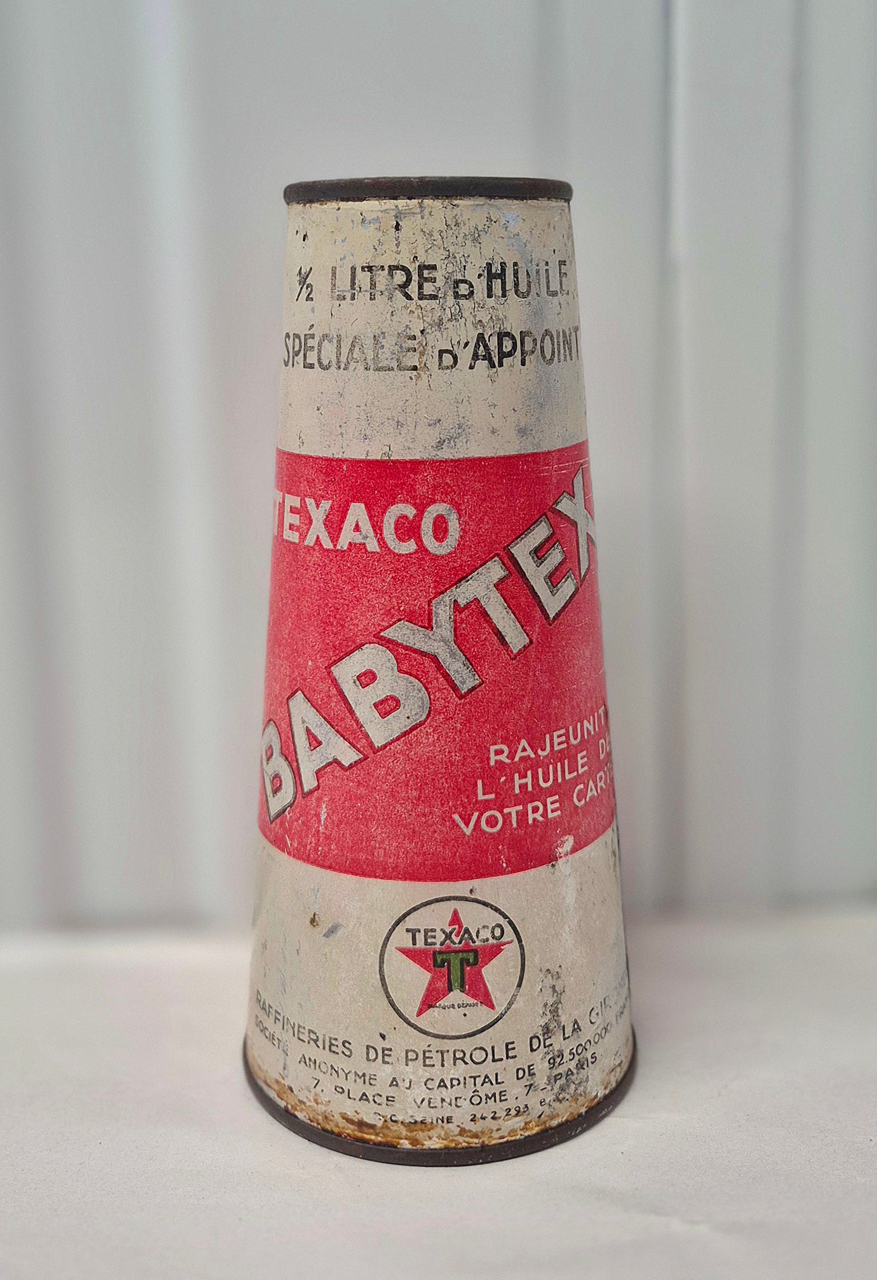 Bidon d'huile conique BABYTEX Texaco, rare version métal et carton, bon état général, exeplaire plein et scellé.