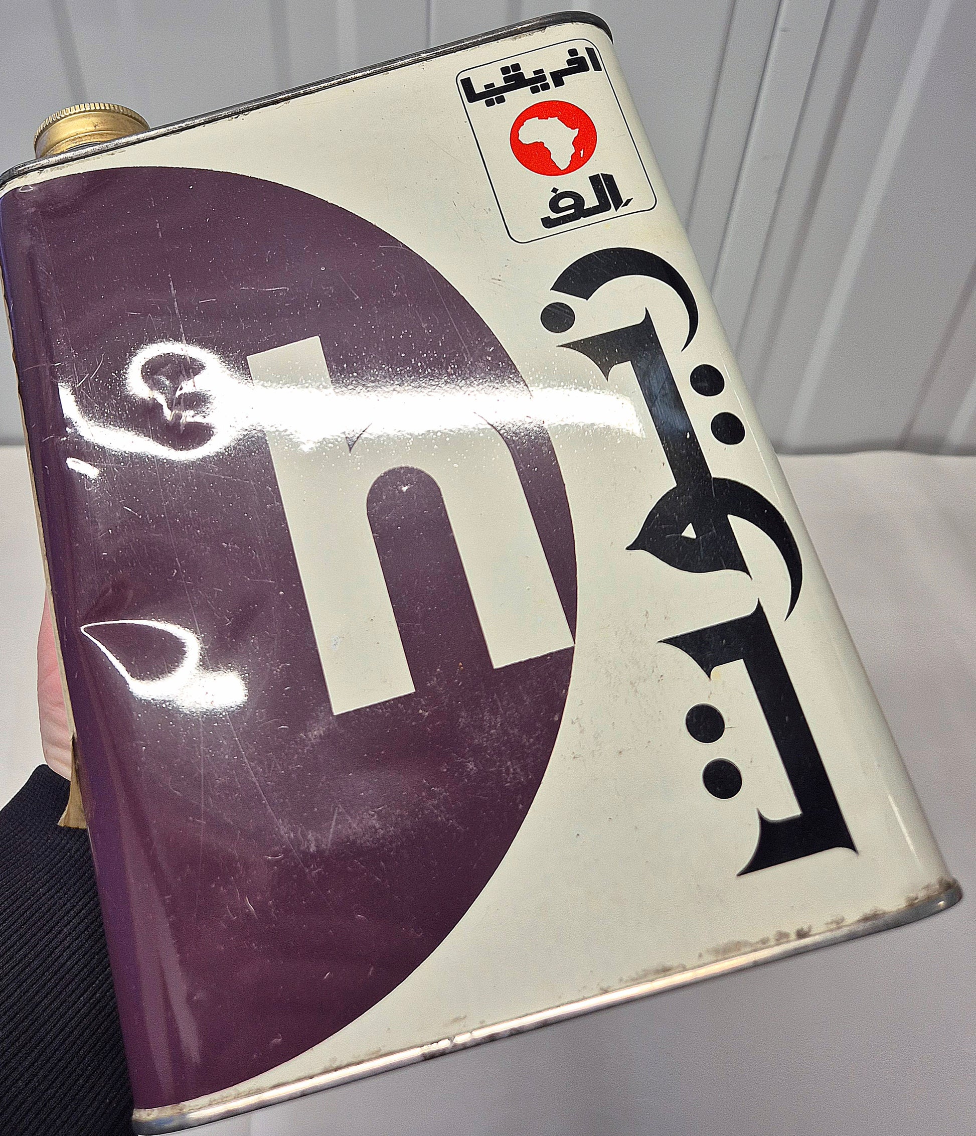 Rare bidon d'huile Elf Afrique, inscriptions en français et arabe... bon état général, litho très brillante, a signaler quelques petits enfoncements, visible sur photo.