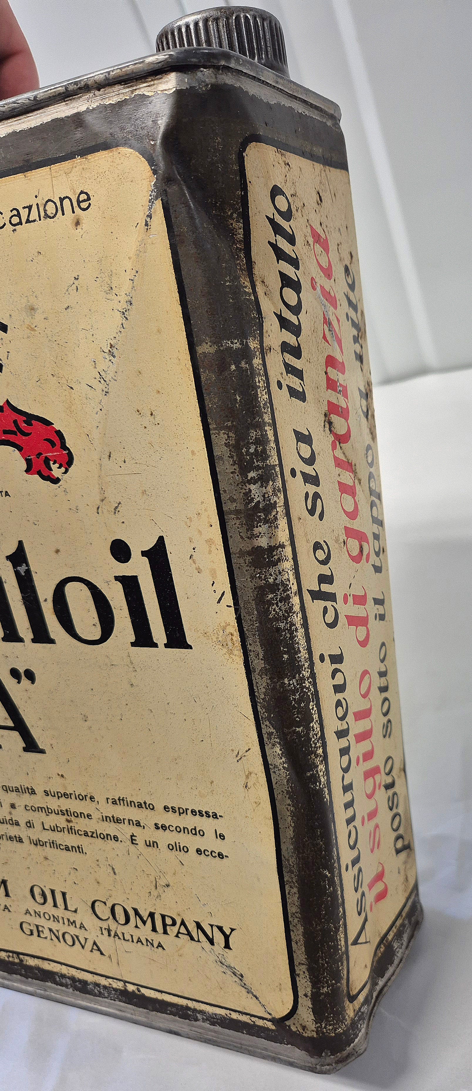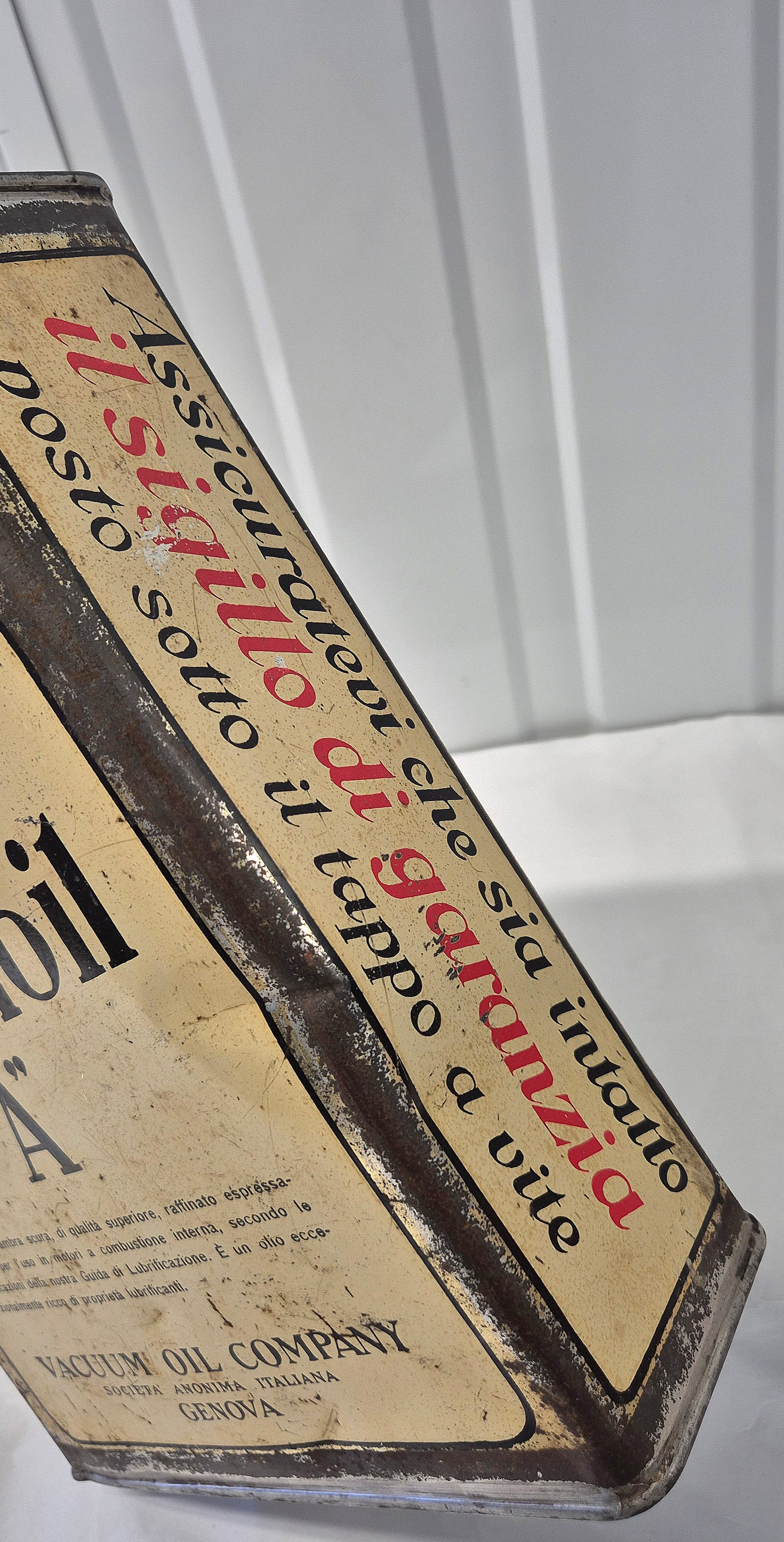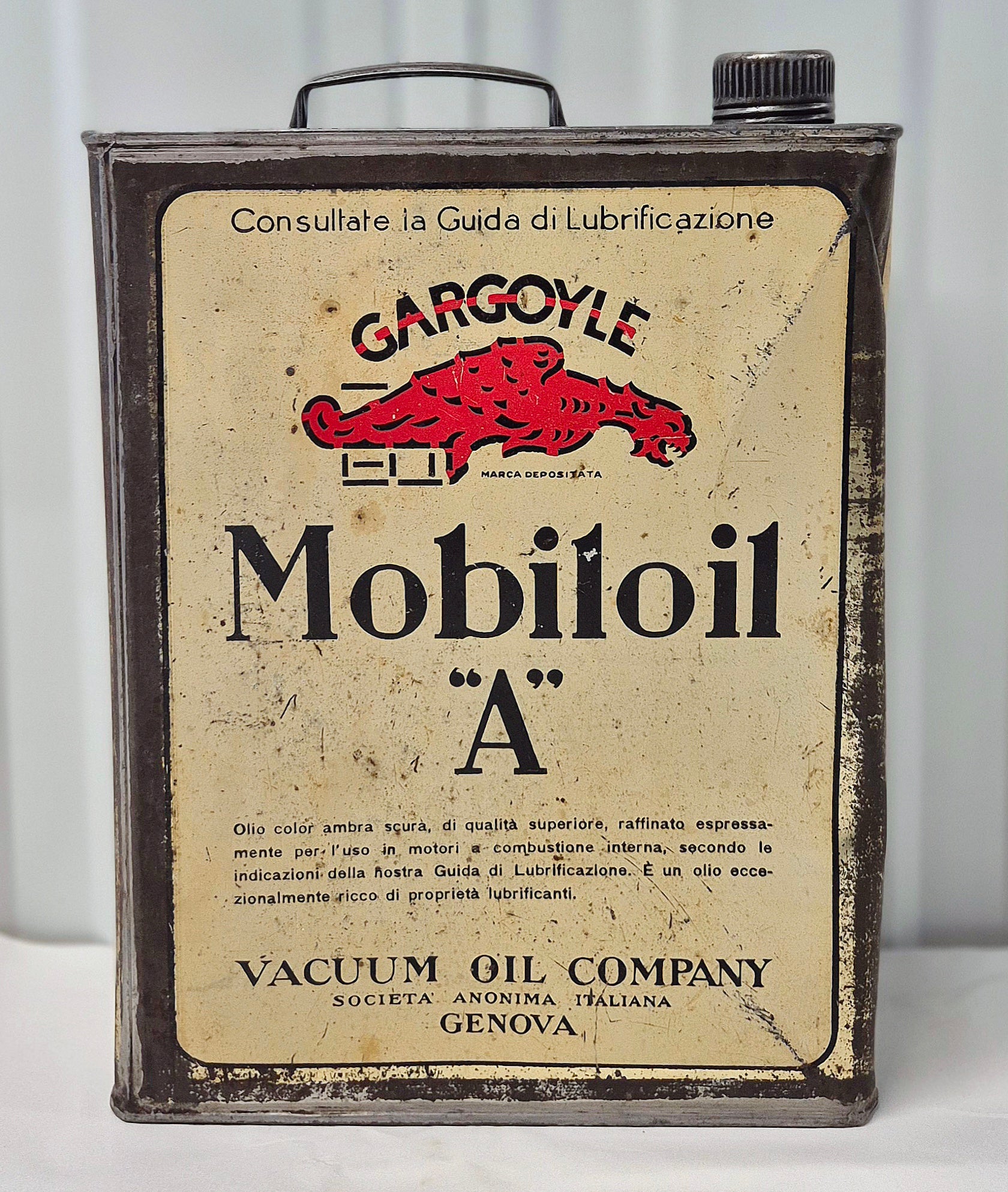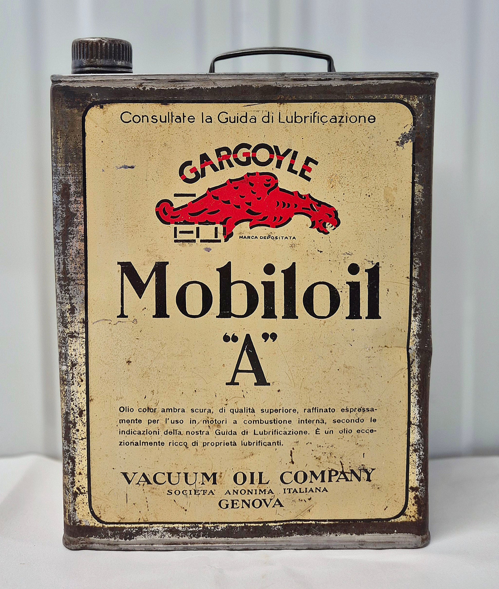 Rare bidon d'huile Mobiloil A italien, format 1 gallon, très bel état général avec poignée et bouchon. Quelques enfoncements a signaler, bien regarder les photos détaillées. Photo 2 avec un bidon deux litres pour avoir une idée sur format, il n'est pas inclus dans le prix ! Envoi avec assurance