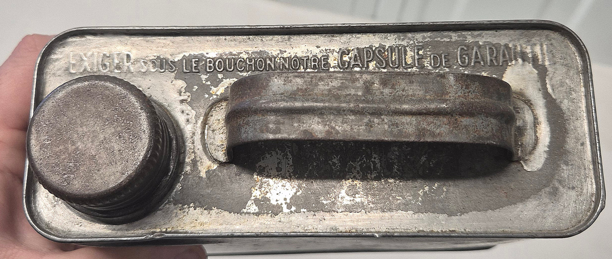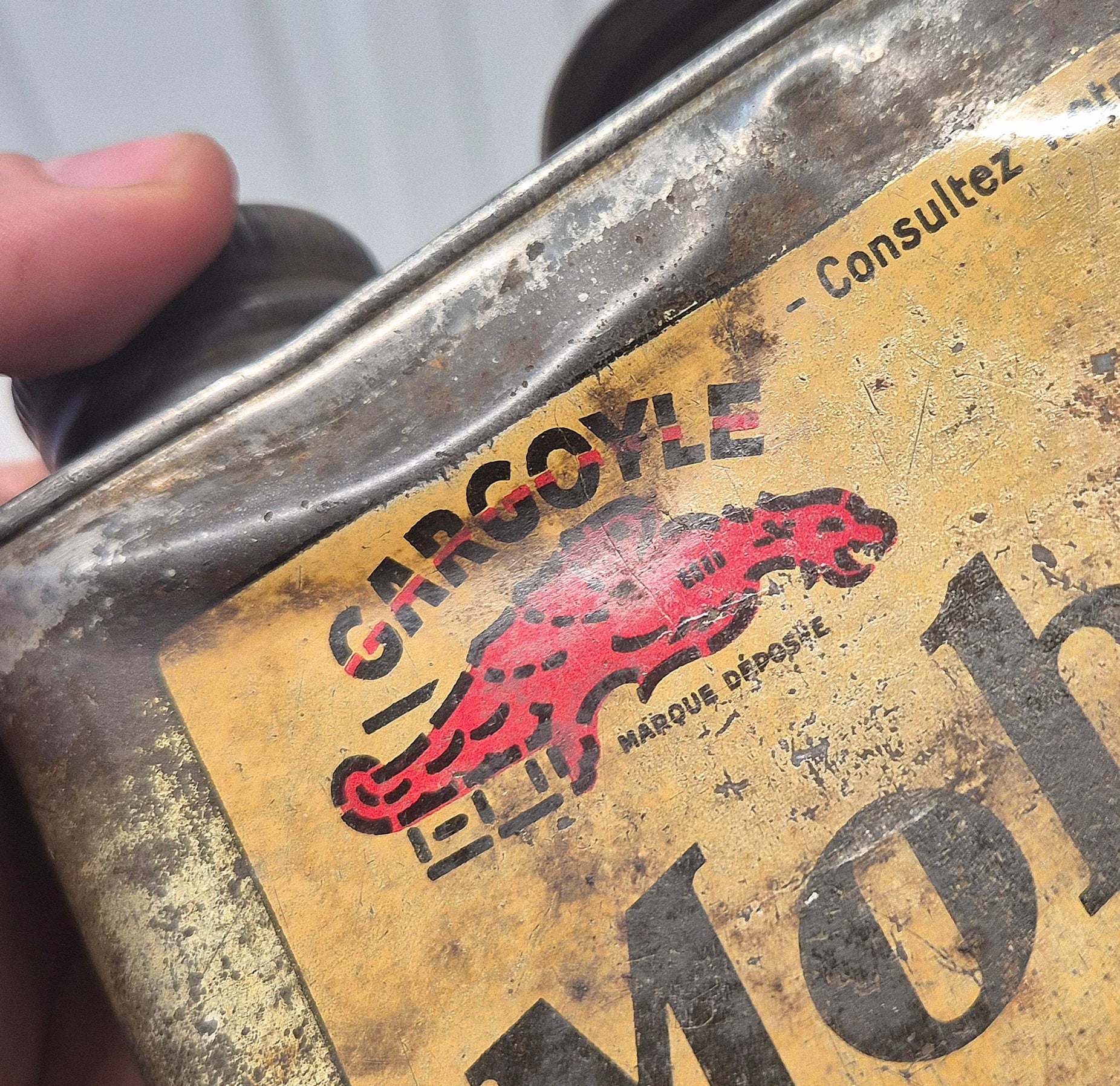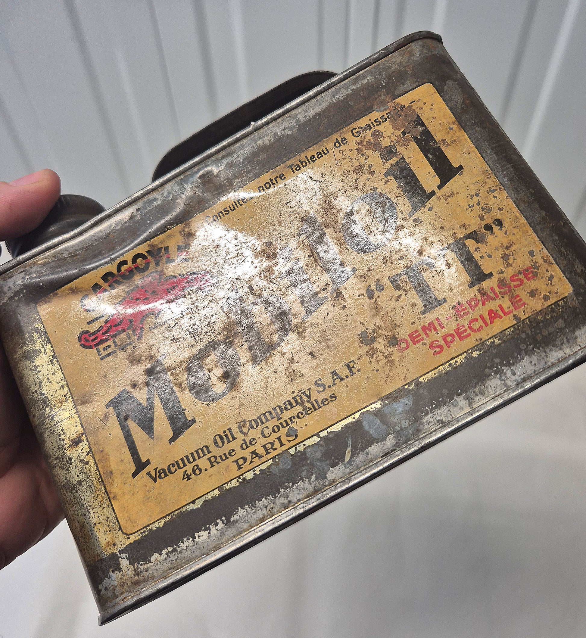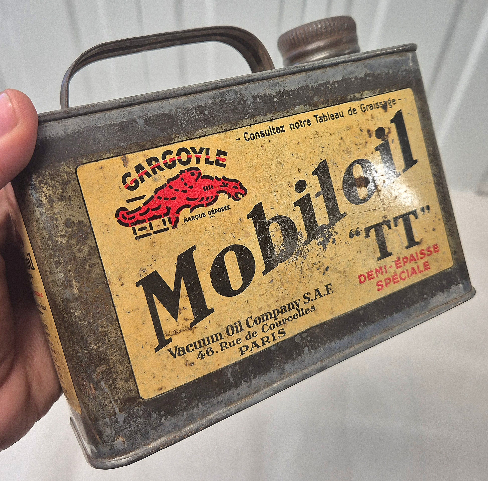 Rare bidon d'huile Mobiloil TT avec poignée, bel état général, a signaler une bosse sur une face, visible en photo 5 et 6, format 1 litre