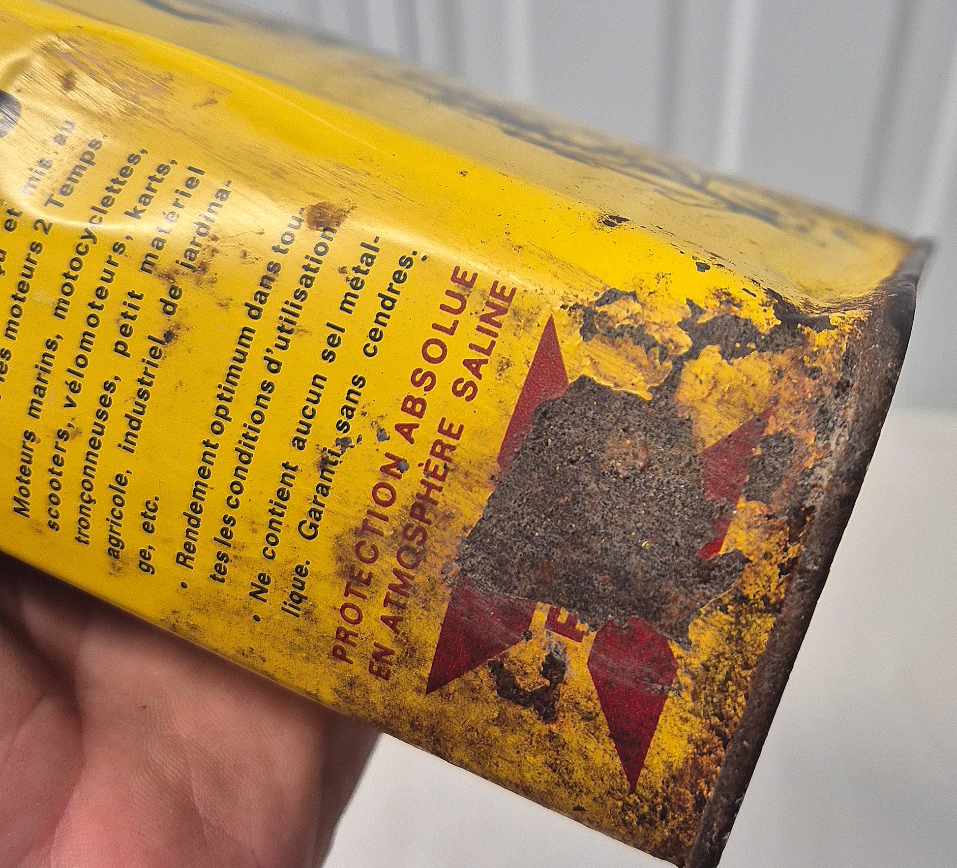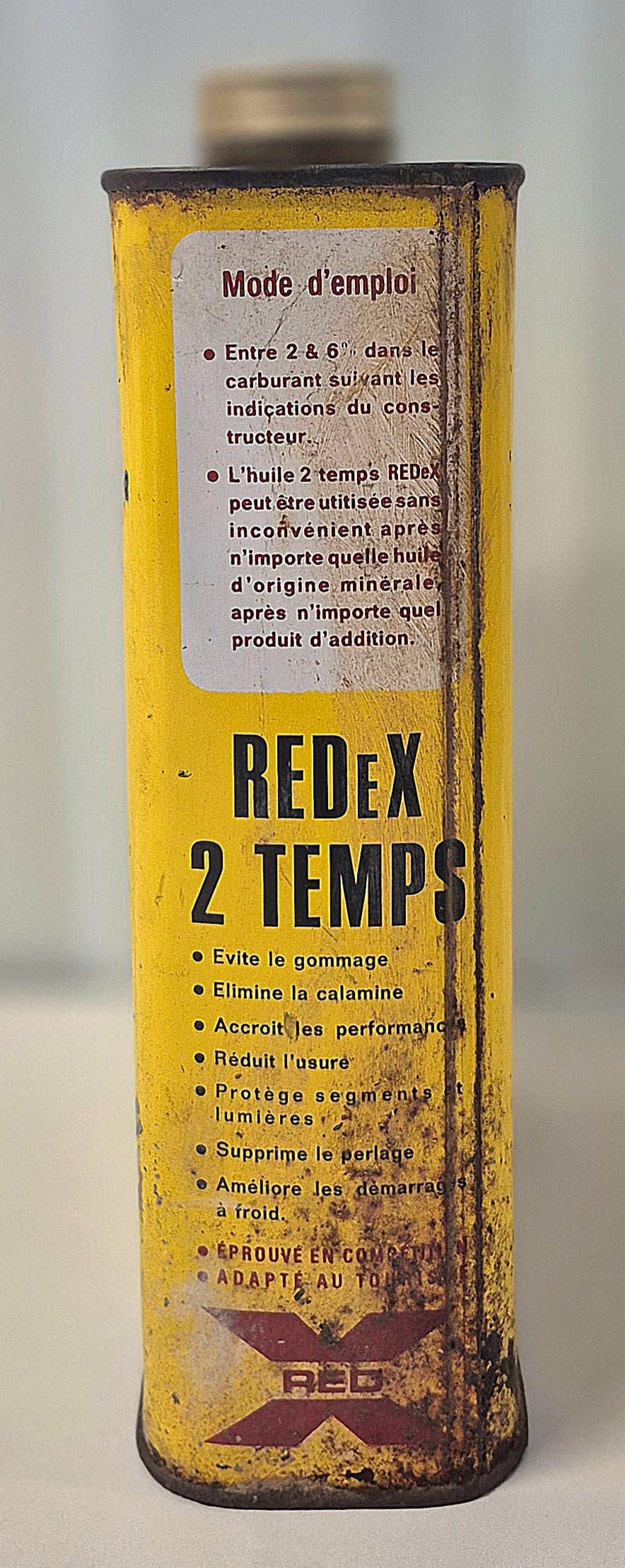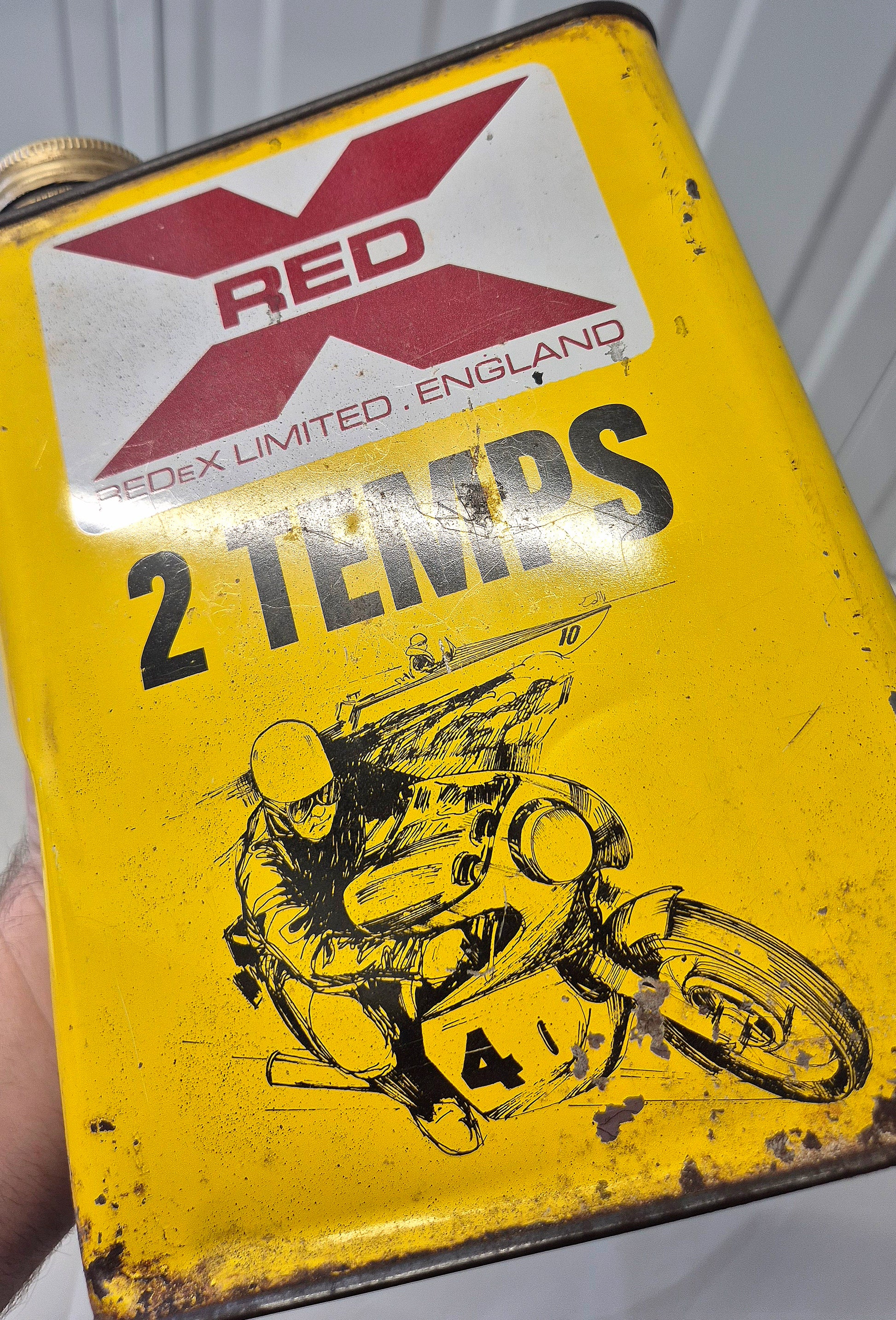 Rare bidon d'huile REDEX 2 temps illustré d'une moto et d'un hors bord, état moyen, traces de rouilles et enfoncements, bien regarder les photos détaillées