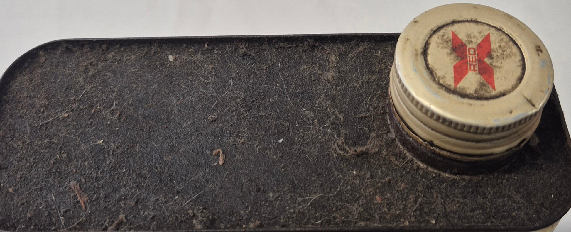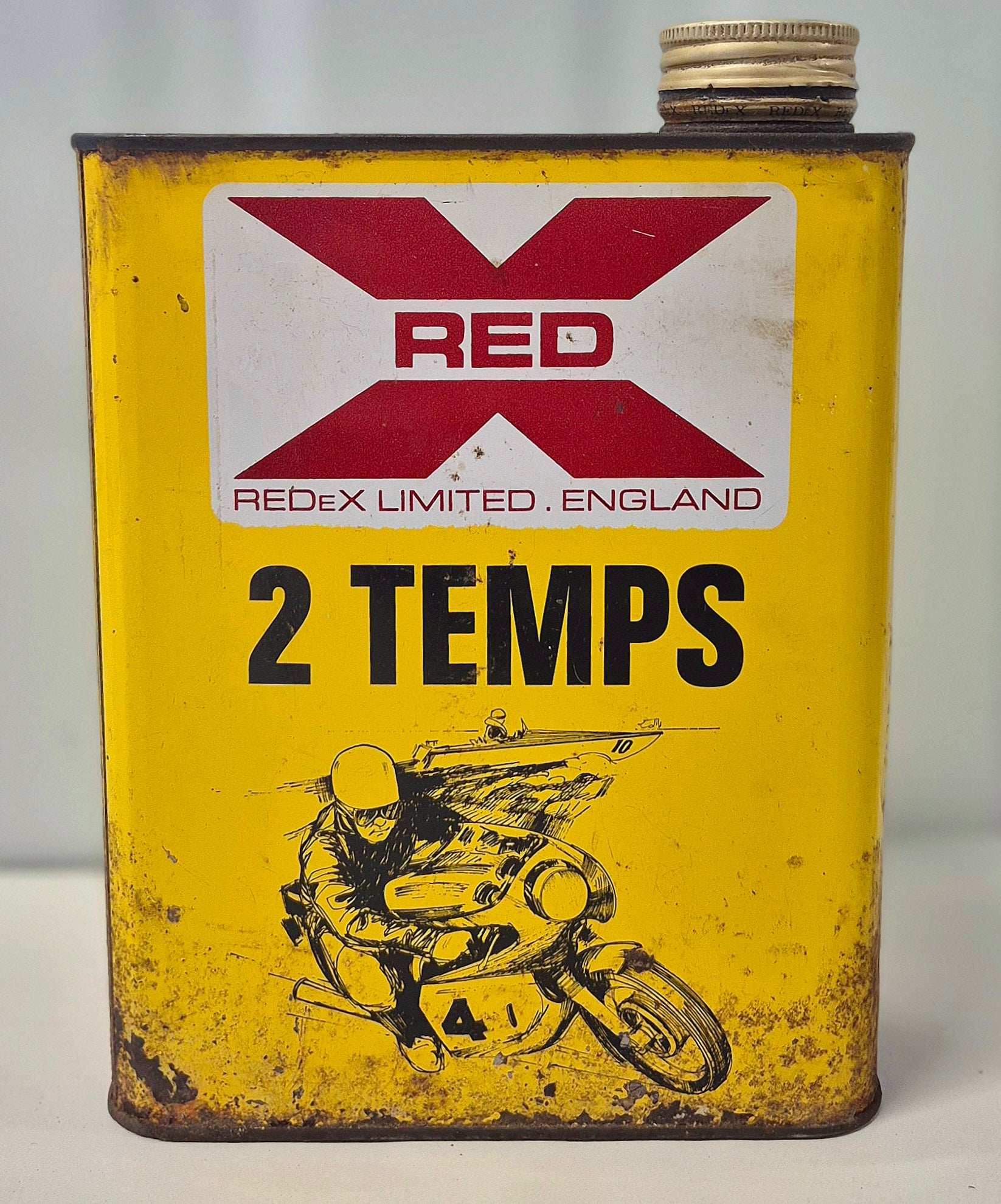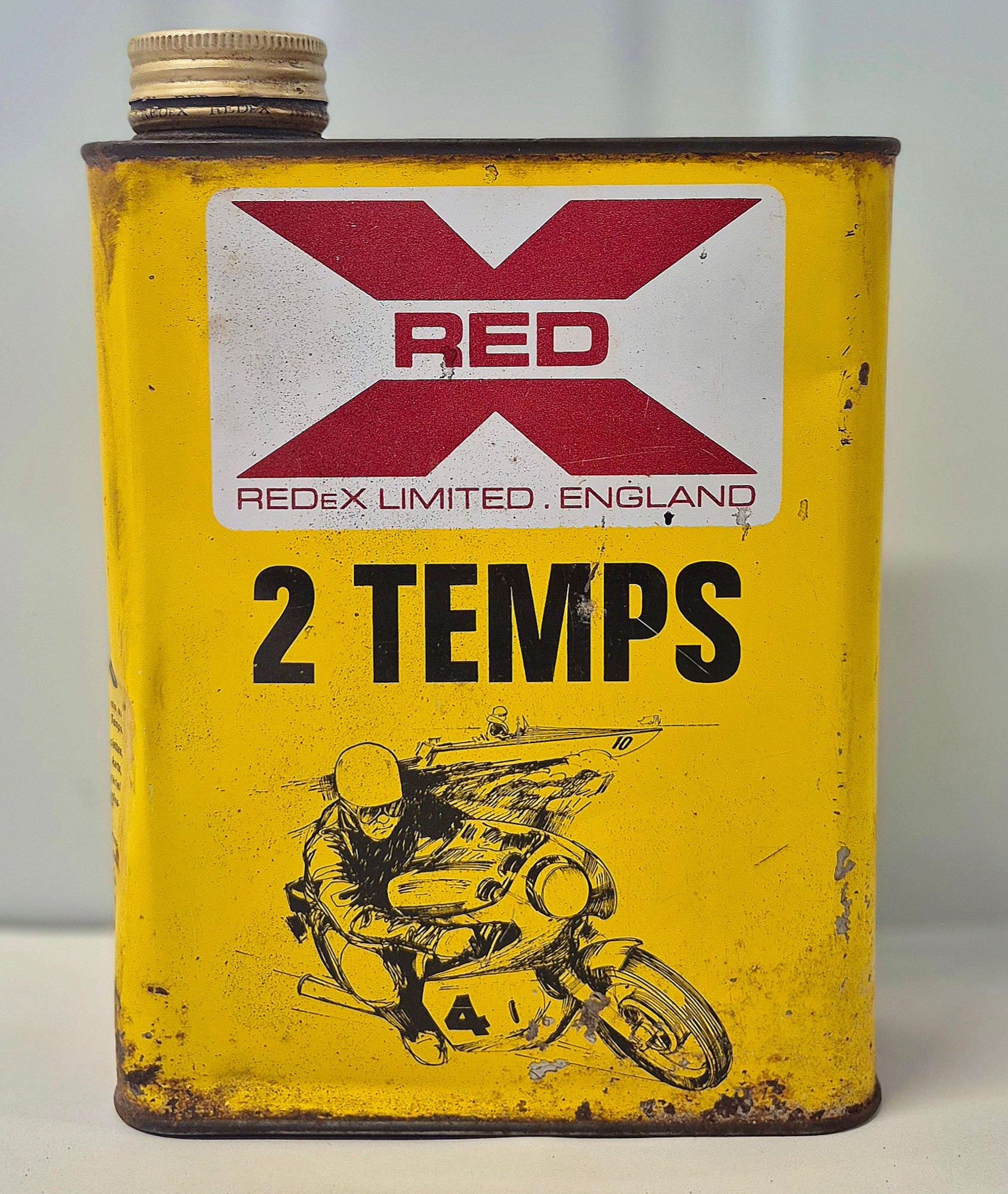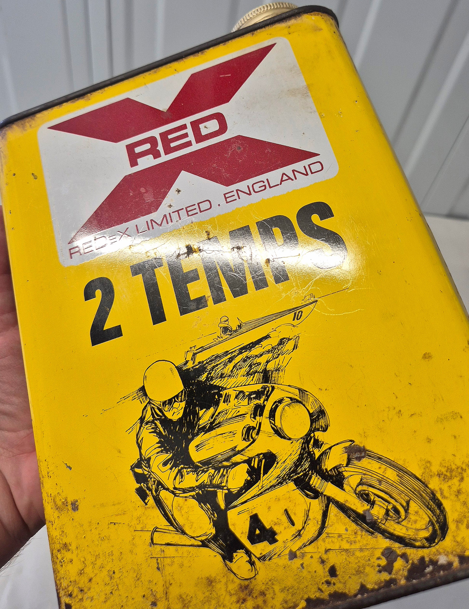 Rare bidon d'huile REDEX 2 temps illustré d'une moto et d'un hors bord, état moyen, traces de rouilles et enfoncements, bien regarder les photos détaillées