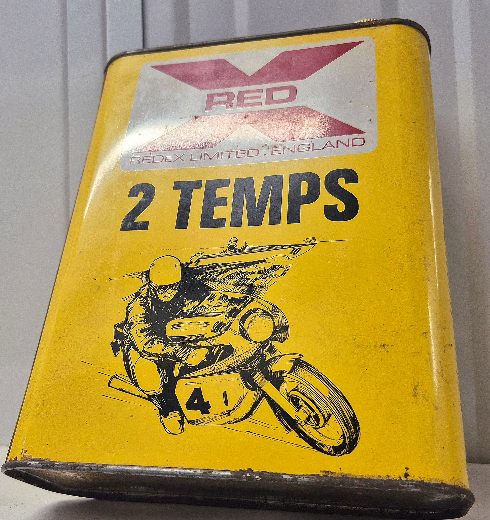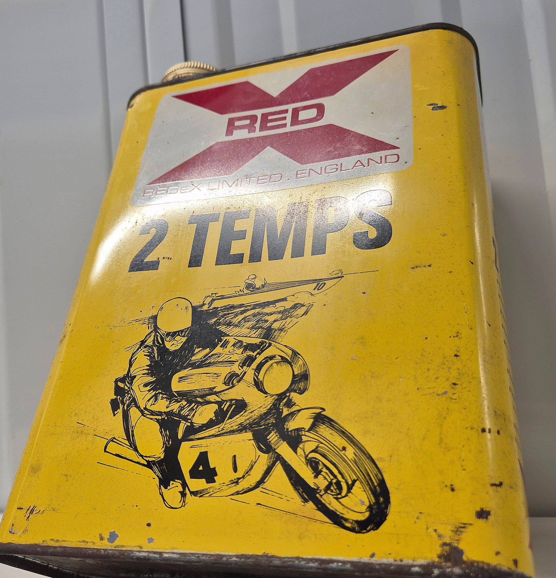Rare et joli bidon Redex moto, 2 temps, bel état général sur les 2 faces, a signaler un enfoncement sur une petite face.