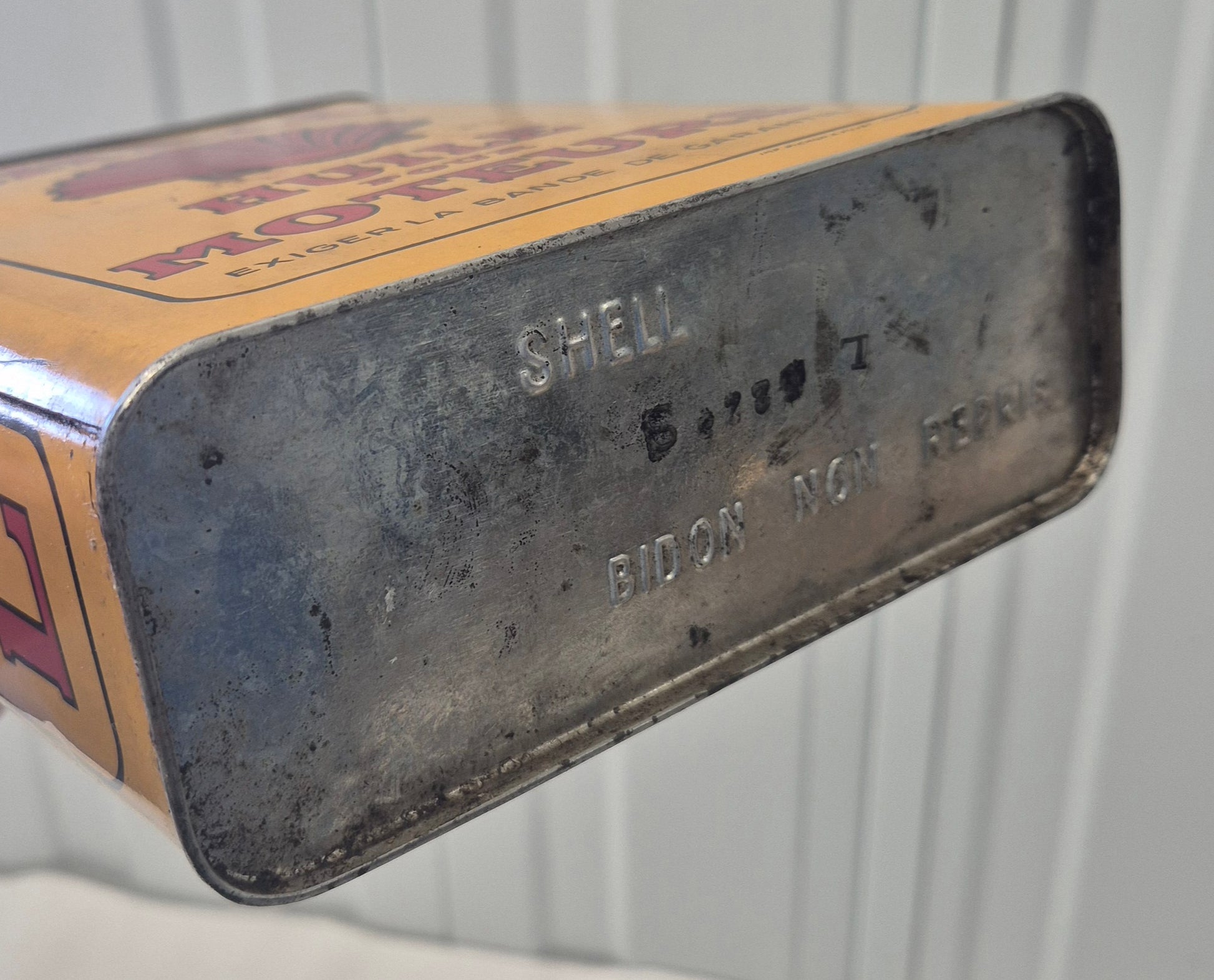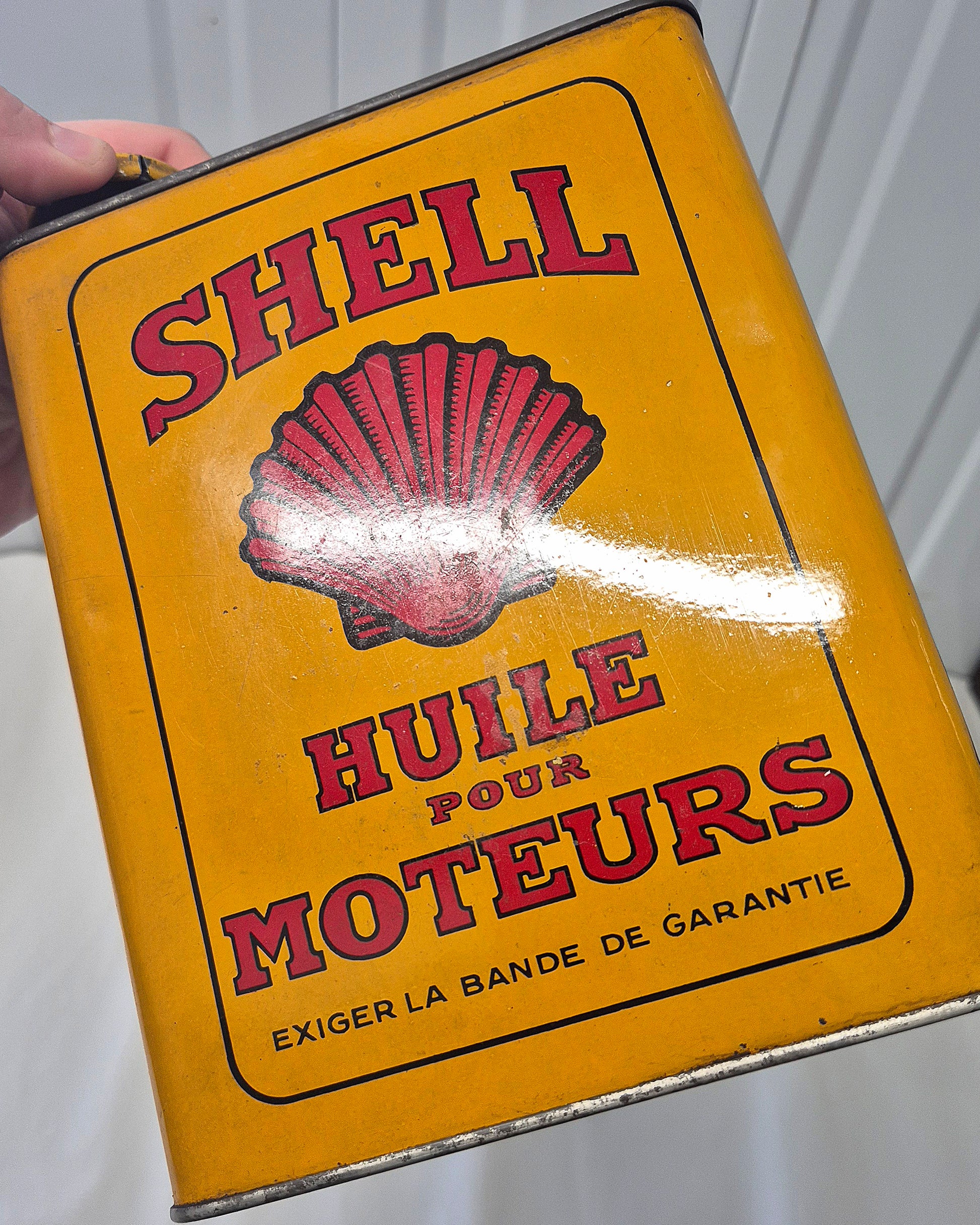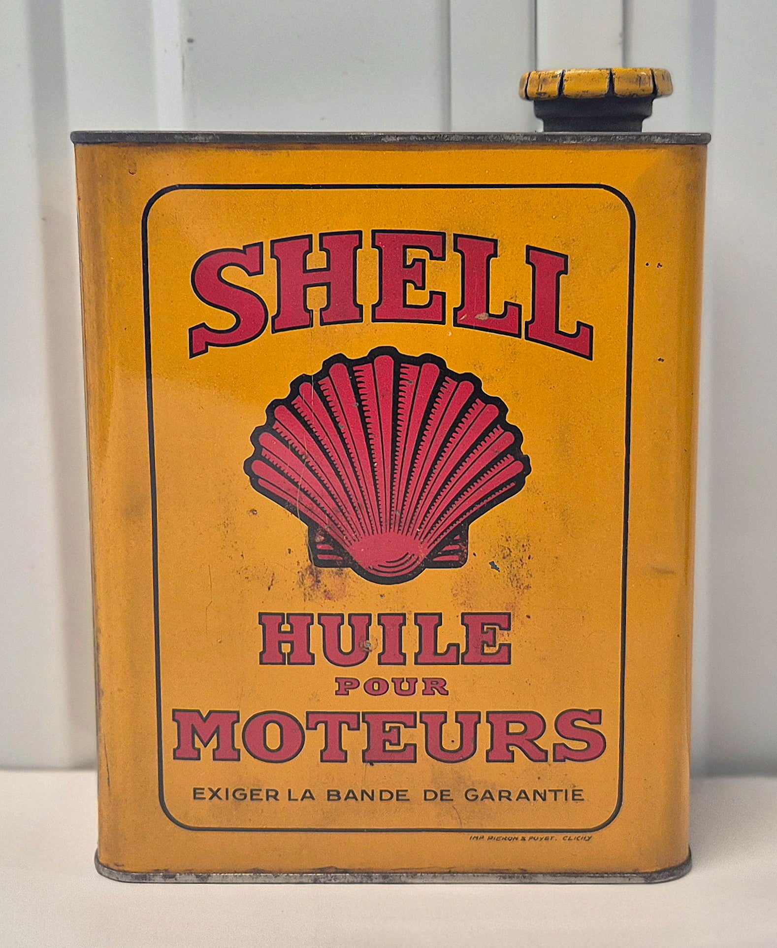 Superbe exemplaire du célèbre bidon d'huile Shell années 30 "coquille", lithographie très brillante, bouchon en tole très propre.