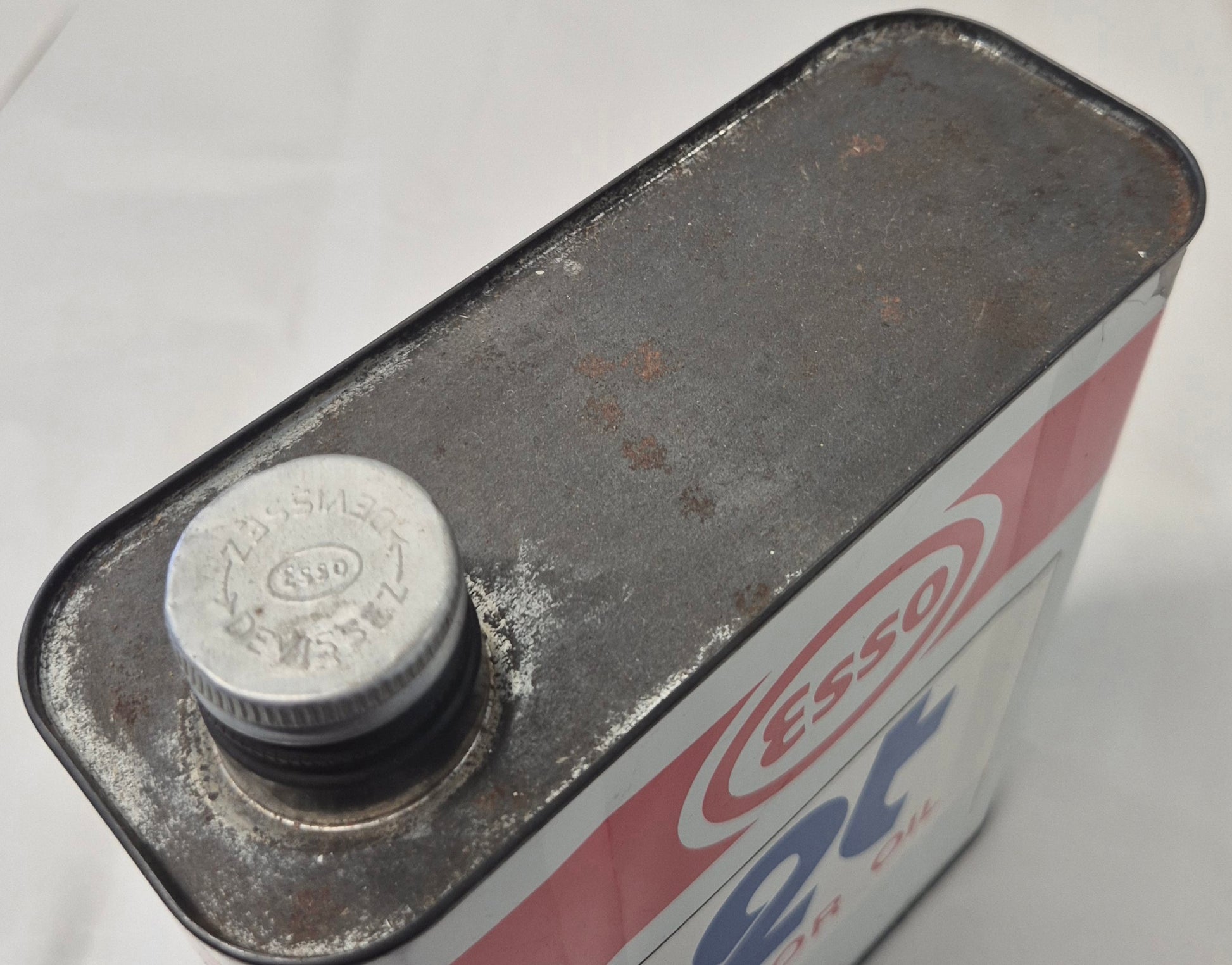 Joli bidon d'huile esso 2 temps, bon état général, sticker 2 t d'origine présent sur une face