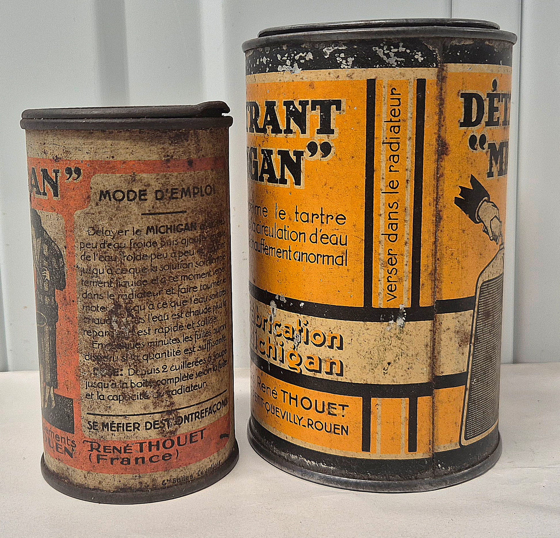 Joli lot de 2 dosettes Michigan, belle illustration avec une automobile et une femme sur la plus petite, et avec un radiateur sur la dosette "détartrant Michigan", bon état général pour les 2.