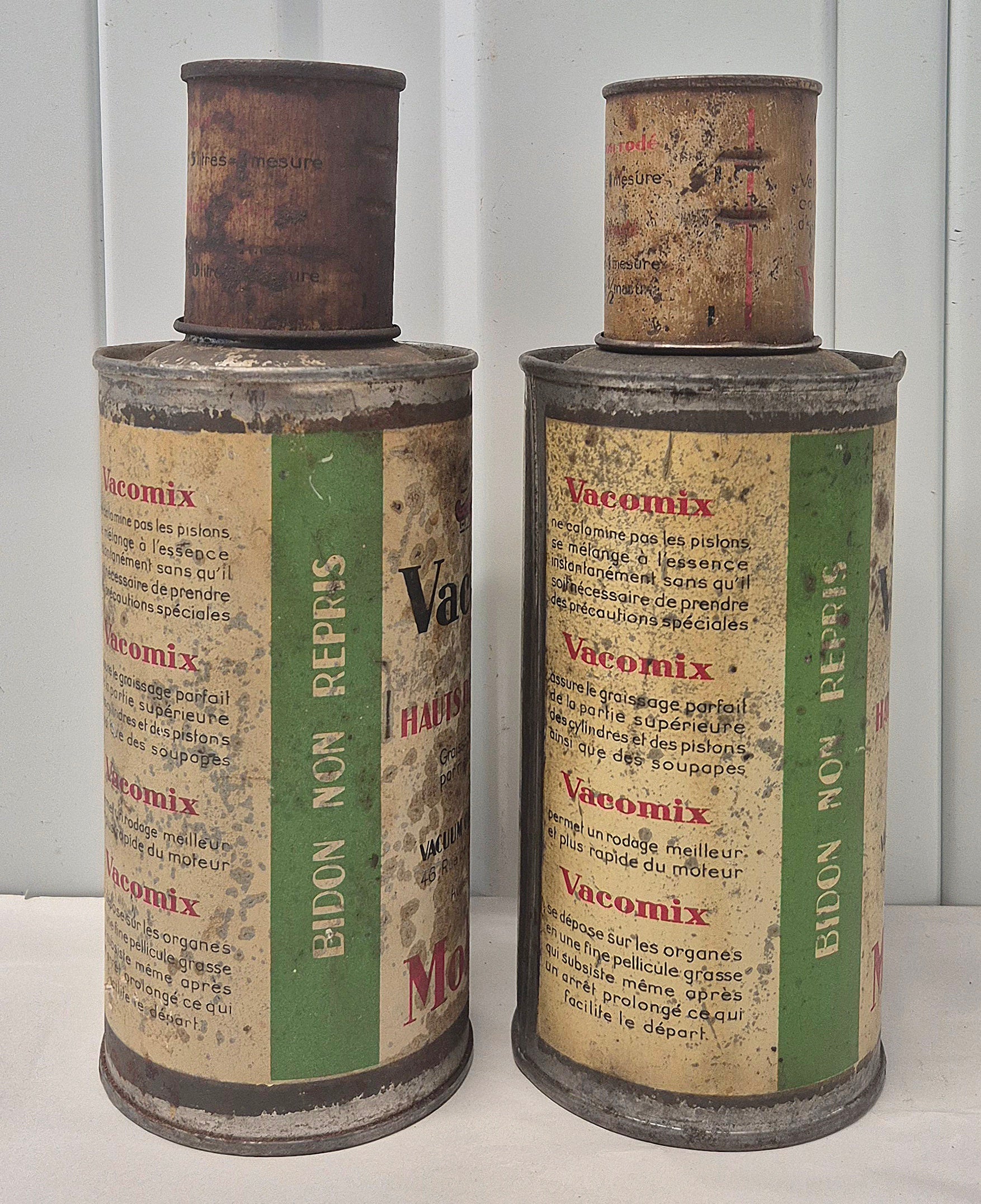 Joli lot de 2 dosettes Vacomix Mobiloil, avec doseur lithographié, état correct pur jus, traces du temps.