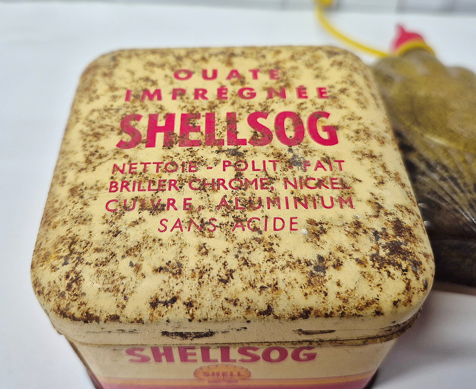 Petit lot Shell pur jus a nettoyer... petit boîte shell sog et burette en plastique... couvercle de la boîte piquée
