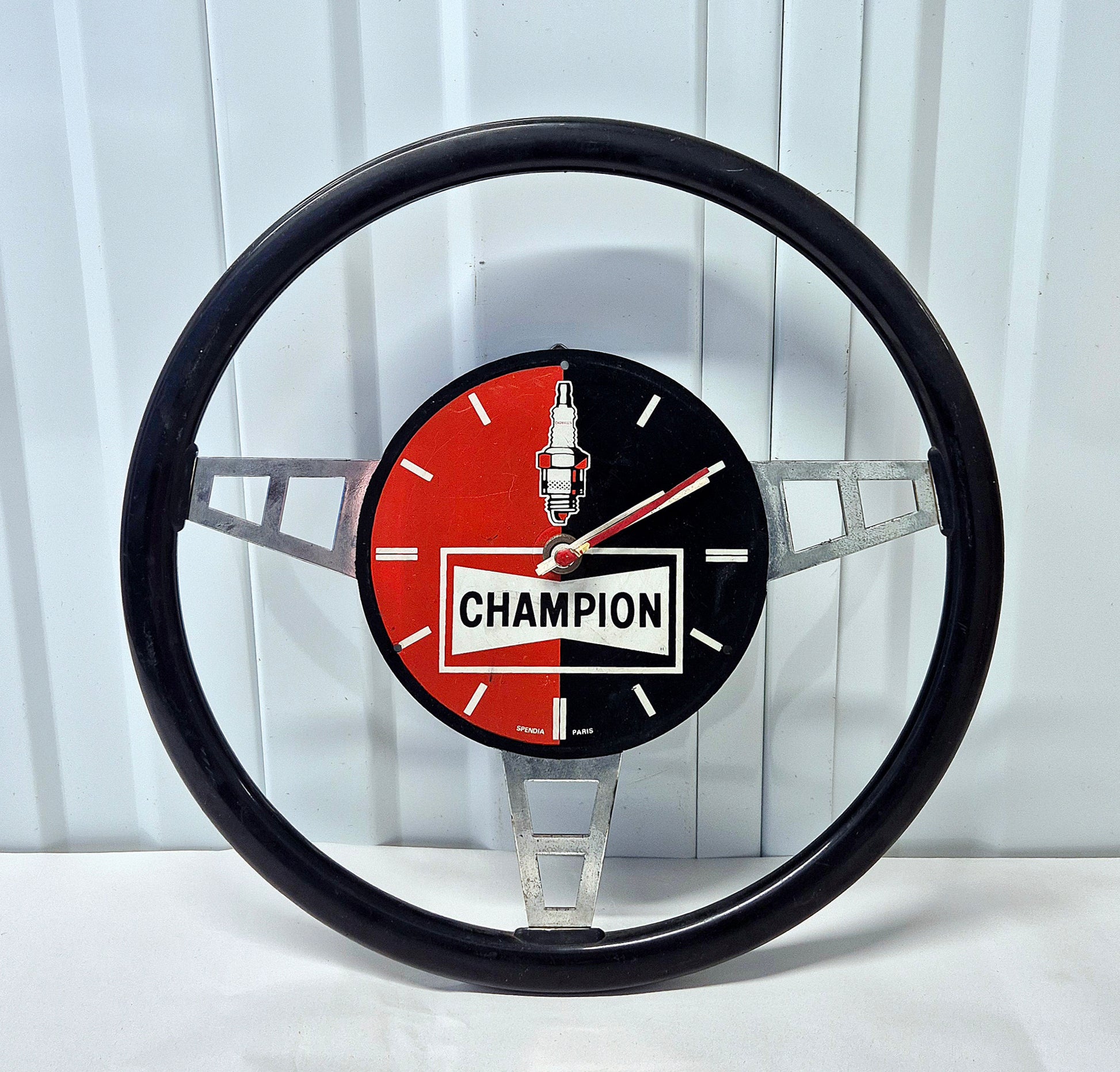 Belle Pendule Champion en forme de volant, bon état général, il manque sans doute la bulle en plastique qui devait etre sur le centre du volant pour protéger les aiguilles, vendue en l'état NON TESTÉE. Diamètre 29cm