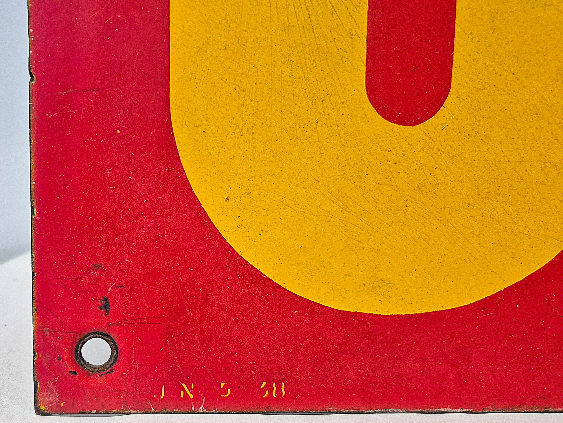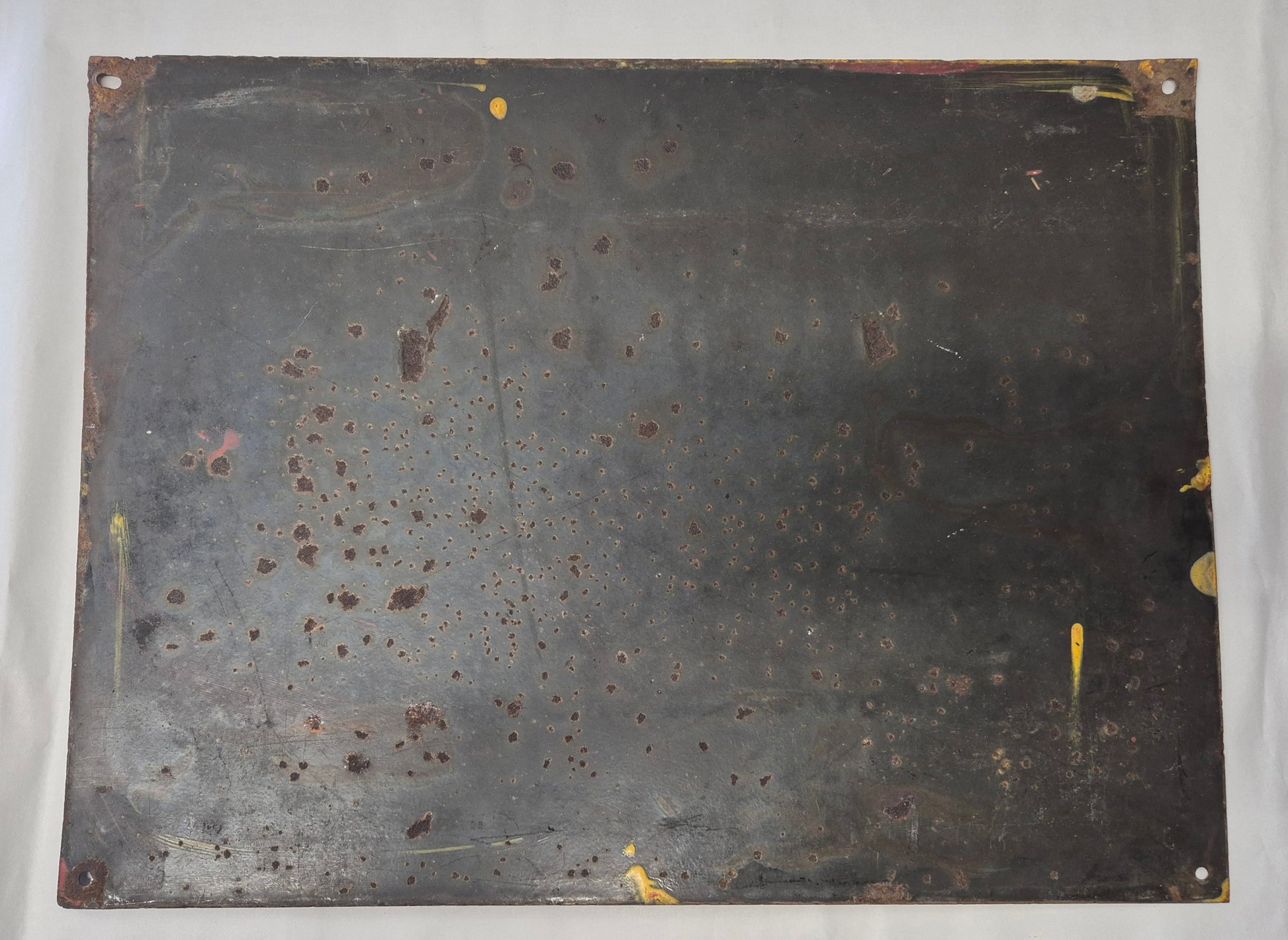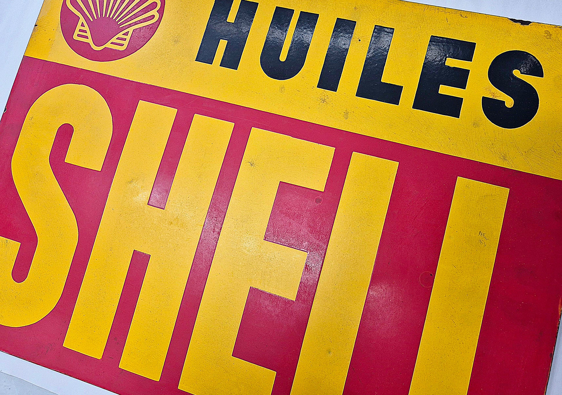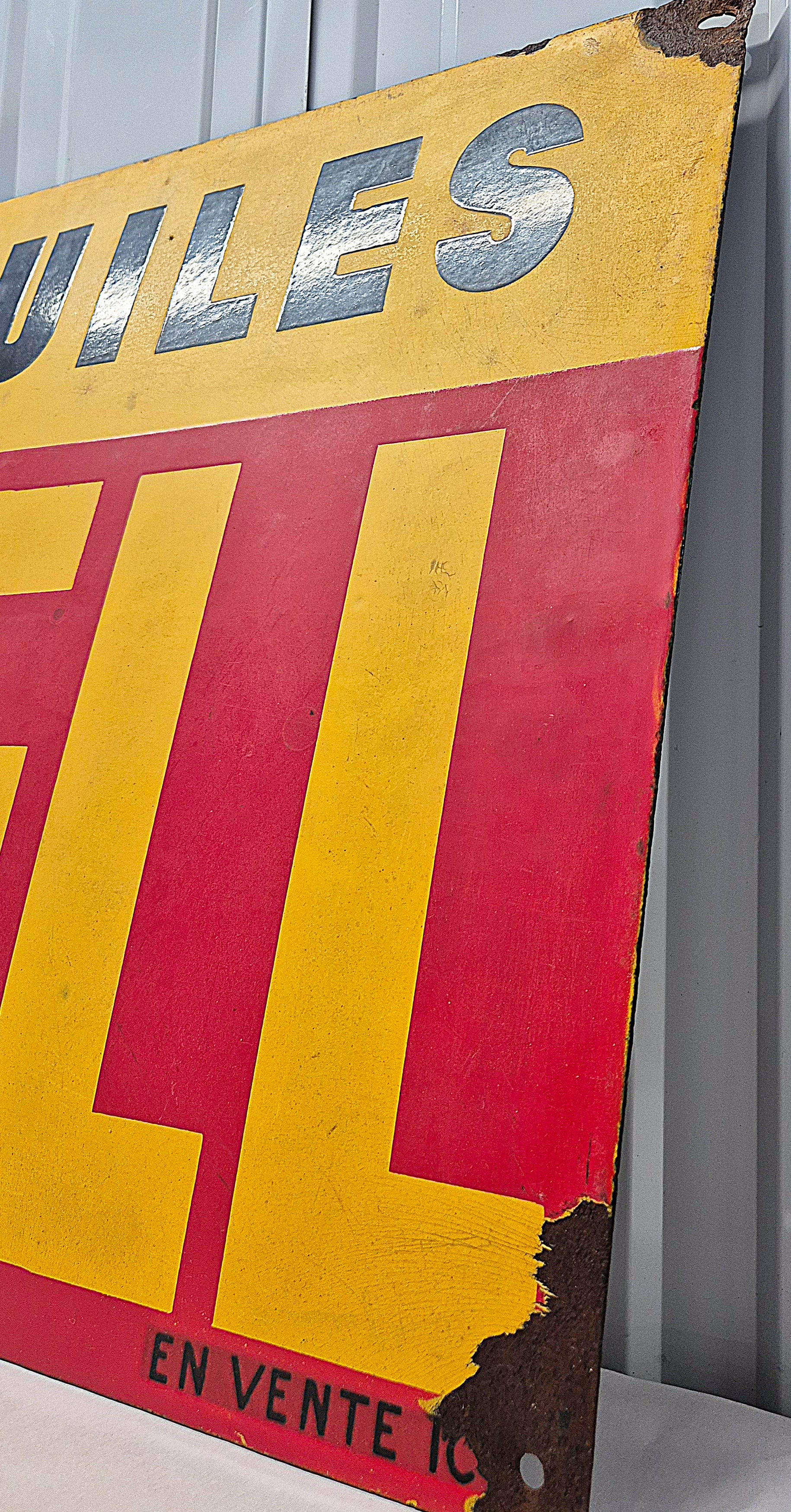 Belle plaque émaillée shell simple face de 1930, éclats aux angles, surface d'émail en état moyen, terne sur le jaune et le rouge, format 60x45cm, envoi avec assurance possible sur demande