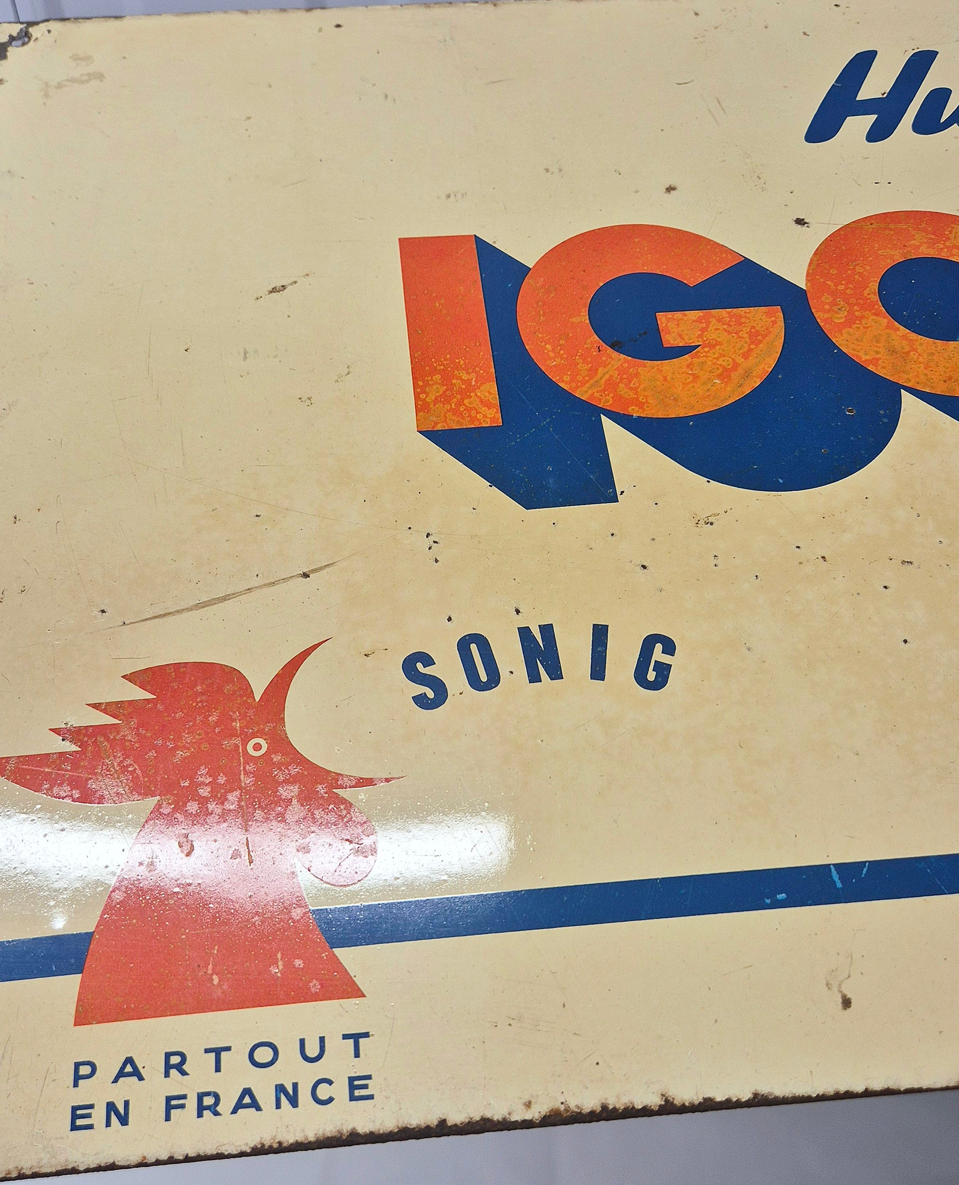 Joli et peu courante tôle Igol illustré du coq, bon état général, litho bien brillante, couleurs légèrement passées. Format 49x34cm